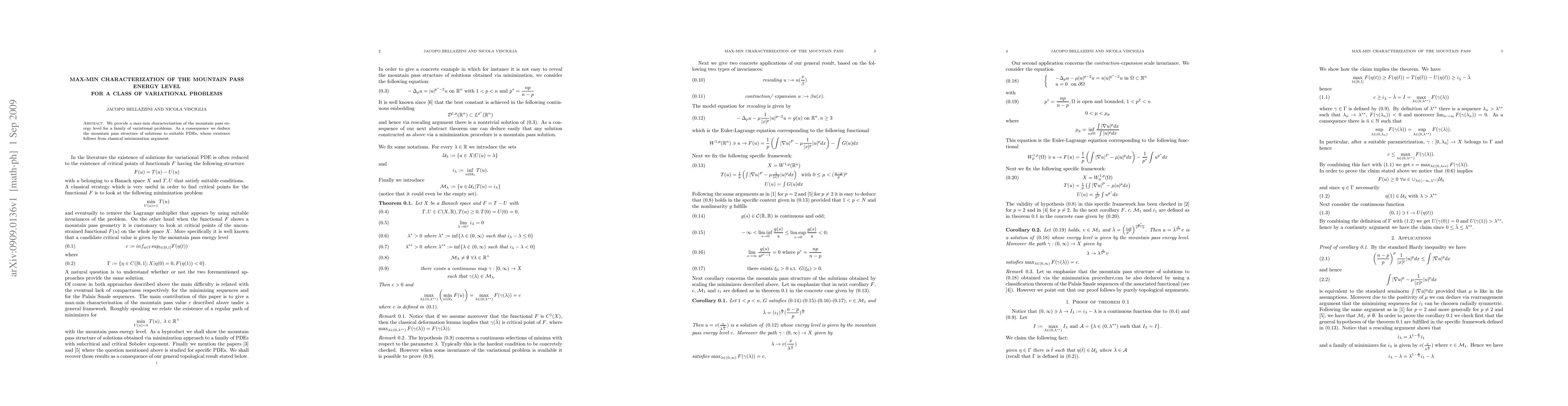 Summary: This paper presents a max-min characterization of the mountain pass energy level for a class of variational problems, and uses this to deduce the mountain pass structure of solutions for associated PDEs, establishing their existence through classical minimization techniques.