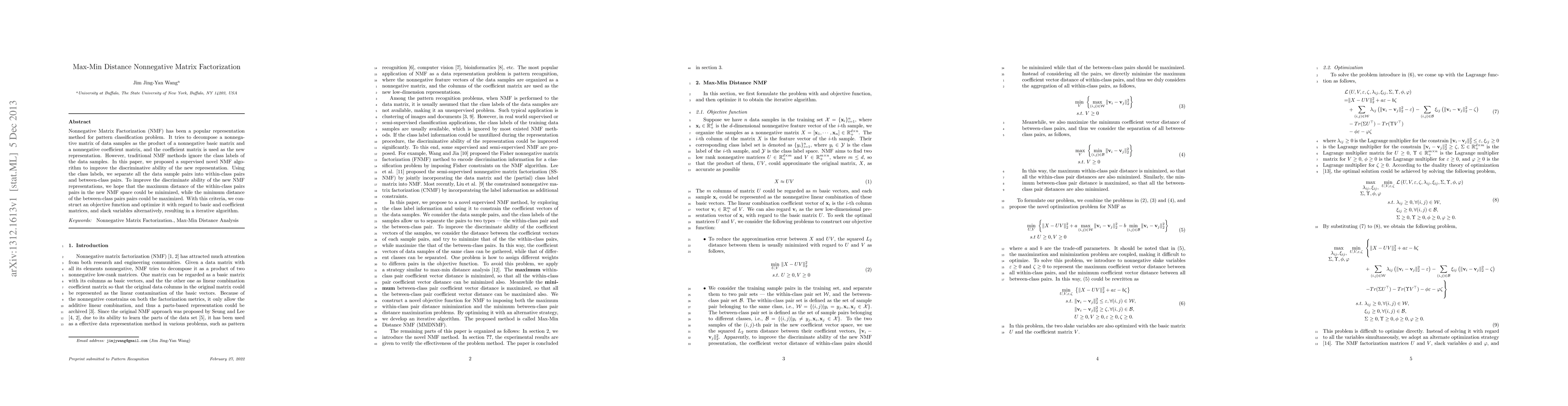 Nonnegative Matrix Factorization (NMF) has been a popular representation method for pattern classification problem. It tries to decompose a nonnegative matrix of data samples as the product of a nonnegative basic matrix and a nonnegative coefficient matrix, and the coefficient matrix is used as the new representation. However, traditional NMF methods ignore the class labels of the data samples. In this paper, we proposed a supervised novel NMF algorithm to improve the discriminative ability of the new representation. Using the class labels, we separate all the data sample pairs into within-class pairs and between-class pairs. To improve the discriminate ability of the new NMF representations, we hope that the maximum distance of the within-class pairs in the new NMF space could be minimized, while the minimum distance of the between-class pairs pairs could be maximized. With this criterion, we construct an objective function and optimize it with regard to basic and coefficient matrices and slack variables alternatively, resulting in a iterative algorithm.