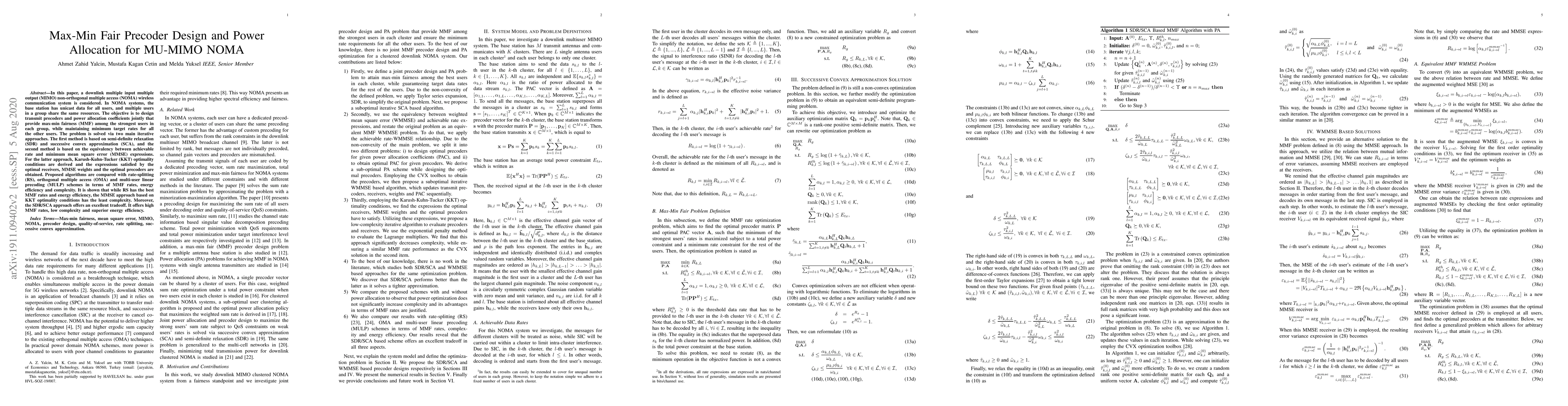 In this paper, a downlink multiple input multiple output (MIMO) non-orthogonal multiple access (NOMA) wireless communication system is considered. In NOMA systems, the base station has unicast data for all users, and multiple users in a group share the same resources. The objective is to design transmit precoders and power allocation coefficients jointly that provide max-min fairness (MMF) among the strongest users in each group, while maintaining minimum target rates for all the other users. The problem is solved via two main iterative approaches. The first method is based on semi-definite relaxation (SDR) and successive convex approximation (SCA), and the second method is based on the equivalency between achievable rate and minimum mean square error (MMSE) expressions. For the latter approach, Karush-Kuhn-Tucker (KKT) optimality conditions are derived and the expressions satisfied by the optimal receivers, MMSE weights and the optimal precoders are obtained. Proposed algorithms are compared with rate-splitting (RS), orthogonal multiple access (OMA) and multi-user linear precoding (MULP) schemes in terms of MMF rates, energy efficiency and complexity. It is shown that while RS has the best MMF rates and energy efficiency, the MMSE approach based on KKT optimality conditions has the least complexity. Moreover, the SDR/SCA approach offers an excellent tradeoff. It offers high MMF rates, low complexity and superior energy efficiency.