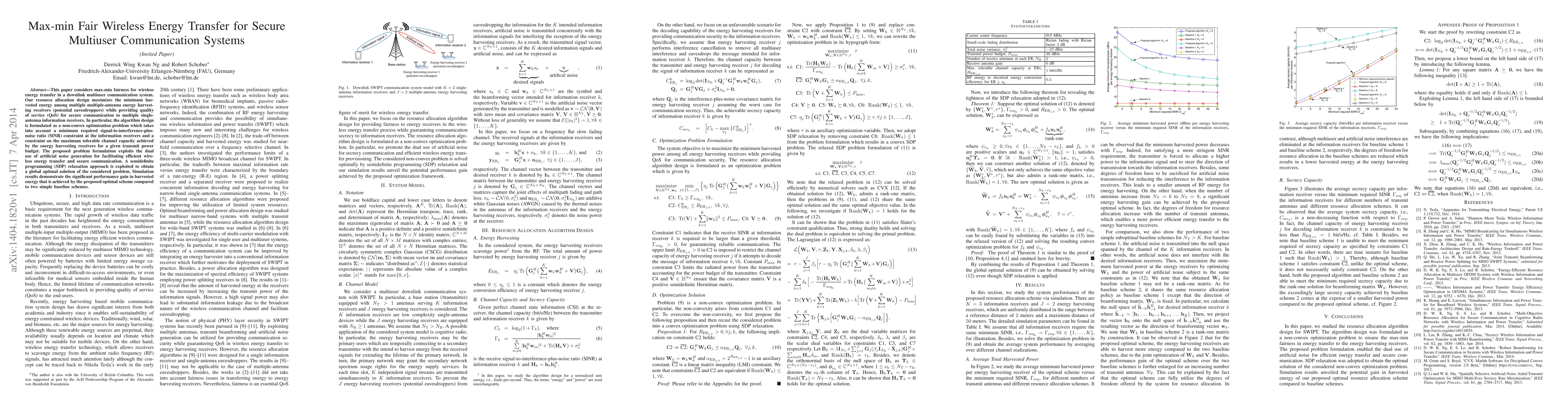 The paper presents an optimal resource allocation algorithm for max-min fair wireless energy transfer in secure multiuser communication systems, utilizing SDP relaxation to solve the non-convex optimization problem.