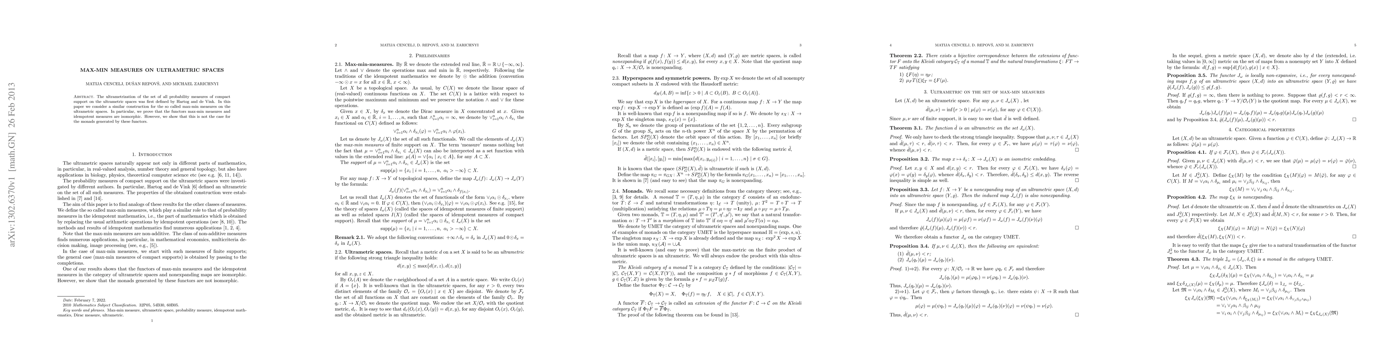This paper explores the concept of max-min measures on ultrametric spaces, proving an isomorphism between max-min measures and idempotent measures functors, while demonstrating a non-isomorphism between the monads generated by these functors.