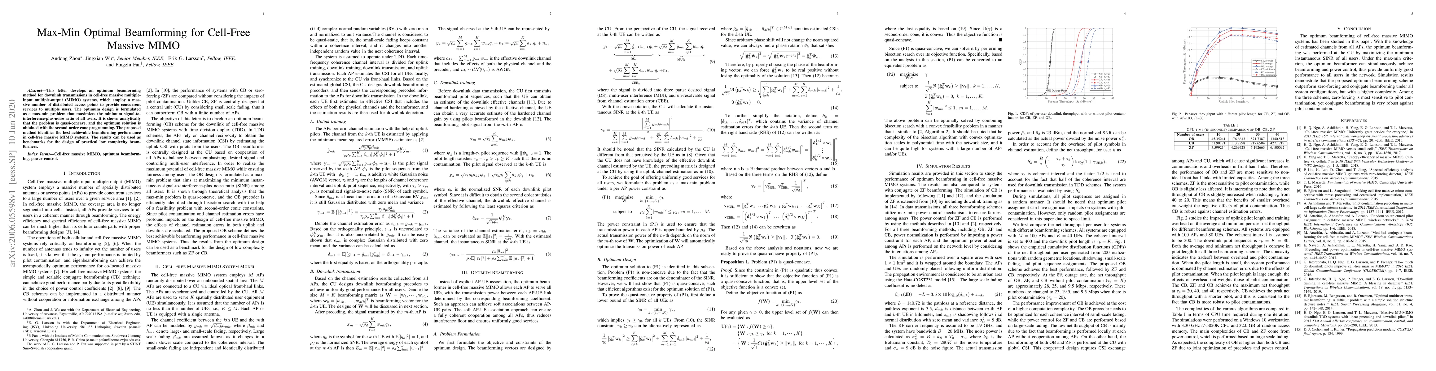 This paper proposes a max-min optimal beamforming method for cell-free massive MIMO systems, maximizing the minimum user signal-to-interference-plus-noise ratio. The solution is derived using second-order cone programming, providing benchmarks for practical low-complexity beamformers.