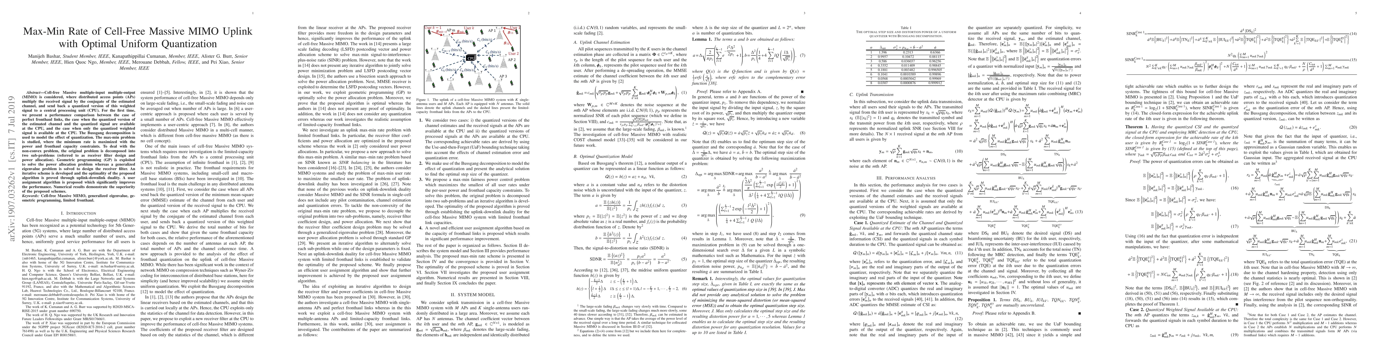 Cell-free Massive multiple-input multiple-output (MIMO) is considered, where distributed access points (APs) multiply the received signal by the conjugate of the estimated channel, and send back a quantized version of this weighted signal to a central processing unit (CPU). For the first time, we present a performance comparison between the case of perfect fronthaul links, the case when the quantized version of the estimated channel and the quantized signal are available at the CPU, and the case when only the quantized weighted signal is available at the CPU. The Bussgang decomposition is used to model the effect of quantization. The max-min problem is studied, where the minimum rate is maximized with the power and fronthaul capacity constraints. To deal with the non-convex problem, the original problem is decomposed into two sub-problems (referred to as receiver filter design and power allocation). Geometric programming (GP) is exploited to solve the power allocation problem whereas a generalized eigenvalue problem is solved to design the receiver filter. An iterative scheme is developed and the optimality of the proposed algorithm is proved through uplink-downlink duality. A user assignment algorithm is proposed which significantly improves the performance. Numerical results demonstrate the superiority of the proposed schemes.