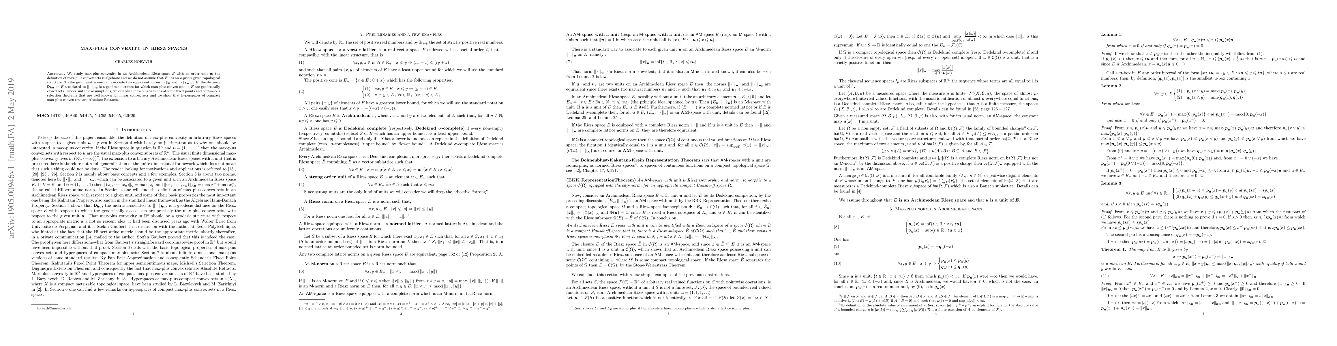 This paper explores max-plus convexity in Archimedean Riesz spaces without assuming a predefined topological structure, establishing geodesic properties and equivalent norms. It also proves max-plus versions of fixed point and selection theorems, and demonstrates that hyperspaces of compact max-plus convex sets are Absolute Retracts.