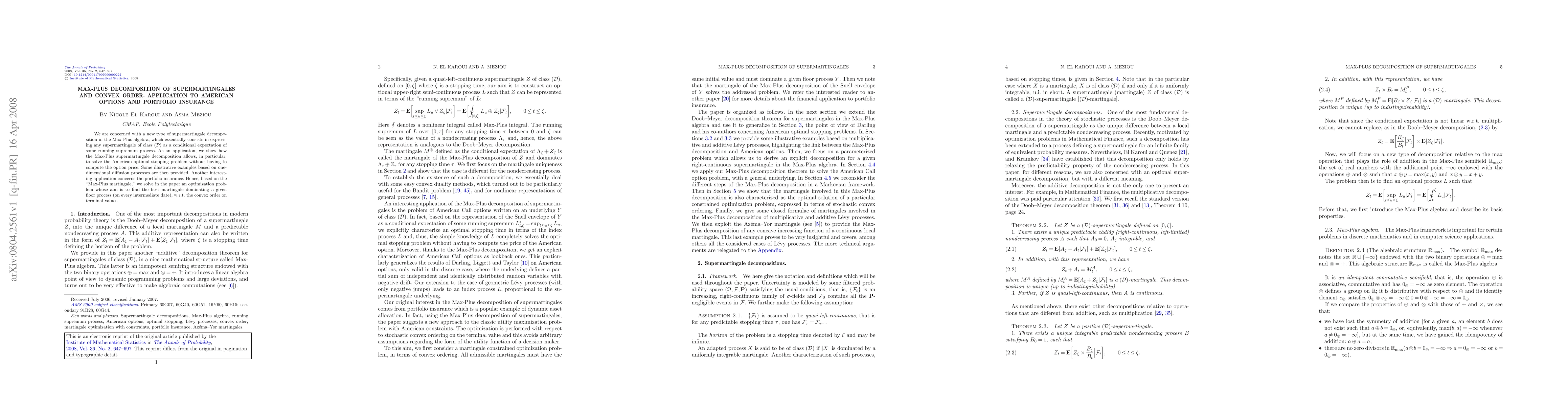 This paper introduces a novel Max-Plus algebra decomposition for supermartingales, enabling the solution of American optimal stopping problems without computing option prices. It also applies this decomposition to portfolio insurance, optimizing the best martingale dominating a given floor process based on the convex order.