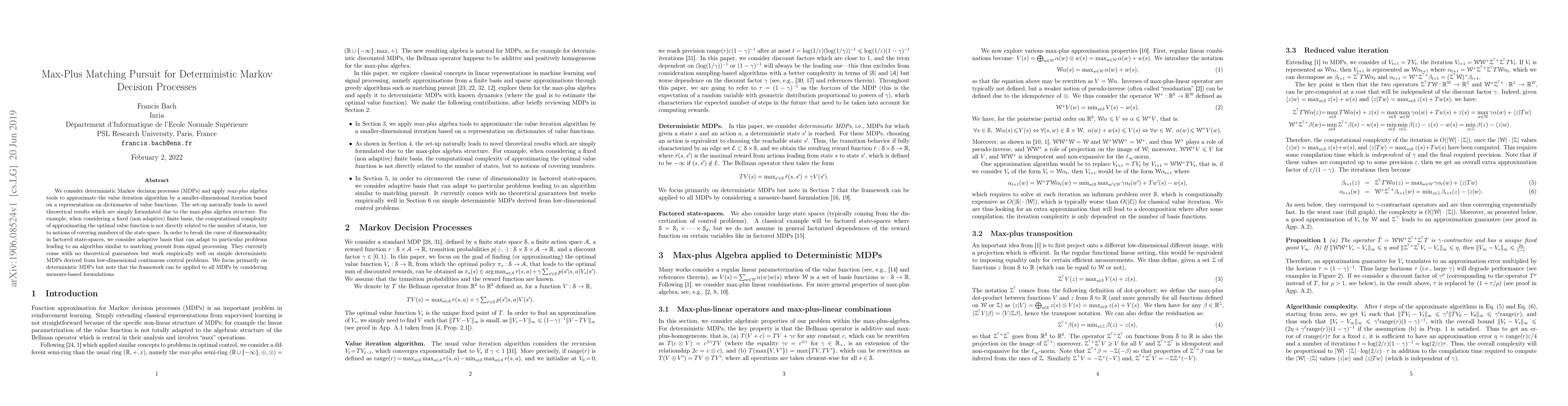 This paper presents a new algorithm for solving deterministic Markov decision processes using max-plus matching pursuit, breaking the curse of dimensionality in factored state-spaces with adaptive basis.