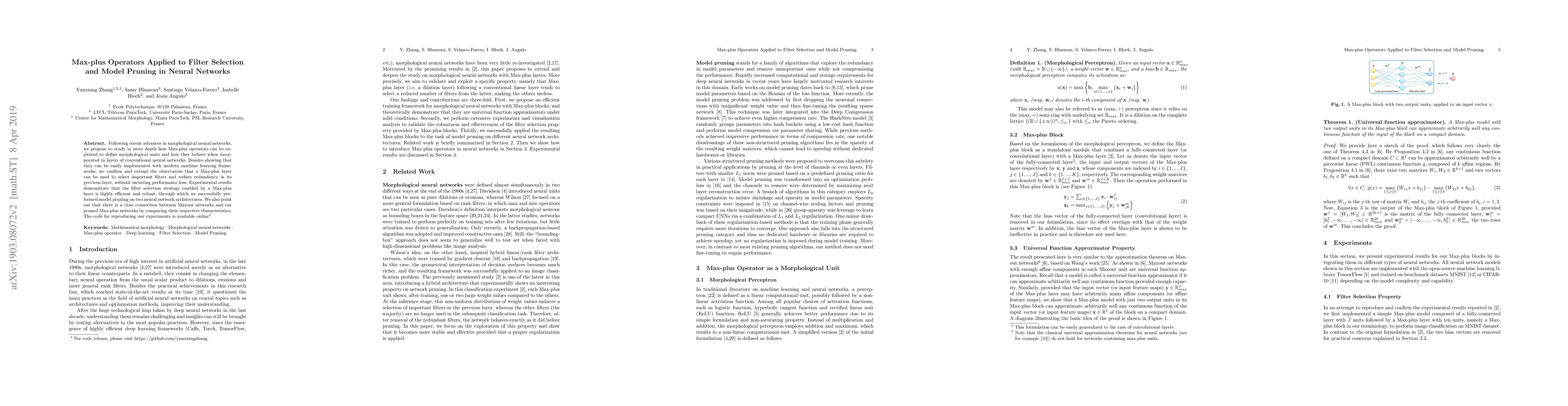 This paper explores the application of Max-plus operators in neural networks to define morphological units and filter selection, demonstrating their effectiveness in reducing model redundancy and enabling efficient model pruning. The results show that Max-plus layers can maintain performance while pruning filters, and a connection between Maxout and pruned Max-plus networks is highlighted.
