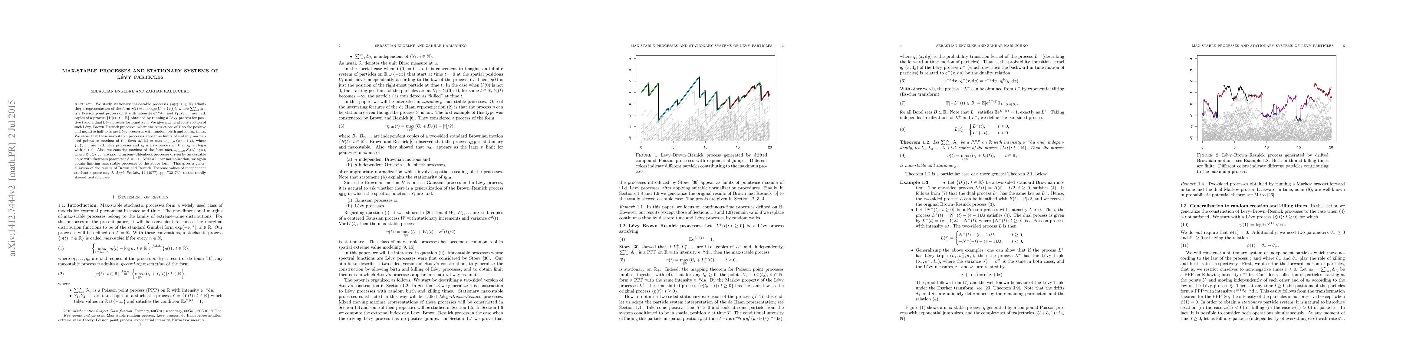 We study stationary max-stable processes $\{\eta(t)\colon t\in\mathbb R\}$ admitting a representation of the form $\eta(t)=\max_{i\in\mathbb N}(U_i+ Y_i(t))$, where $\sum_{i=1}^{\infty} \delta_{U_i}$ is a Poisson point process on $\mathbb R$ with intensity ${\rm e}^{-u} {\rm d} u$, and $Y_1,Y_2,\ldots$ are i.i.d.\ copies of a process $\{Y(t)\colon t\in\mathbb R\}$ obtained by running a L\'evy process for positive $t$ and a dual L\'evy process for negative $t$. We give a general construction of such L\'evy-Brown-Resnick processes, where the restrictions of $Y$ to the positive and negative half-axes are L\'evy processes with random birth and killing times. We show that these max-stable processes appear as limits of suitably normalized pointwise maxima of the form $M_n(t)=\max_{i=1,\ldots,n} \xi_i(s_n+t)$, where $\xi_1,\xi_2,\ldots$ are i.i.d.\ L\'evy processes and $s_n$ is a sequence such that $s_n\sim c \log n$ with $c>0$. Also, we consider maxima of the form $\max_{i=1,\ldots,n} Z_i(t/\log n)$, where $Z_1,Z_2,\ldots$ are i.i.d.\ Ornstein--Uhlenbeck processes driven by an $\alpha$-stable noise with skewness parameter $\beta=-1$. After a linear normalization, we again obtain limiting max-stable processes of the above form. This gives a generalization of the results of Brown and Resnick [Extreme values of independent stochastic processes, J.\ Appl.\ Probab., 14 (1977), pp.\ 732--739] to the totally skewed $\alpha$-stable case.