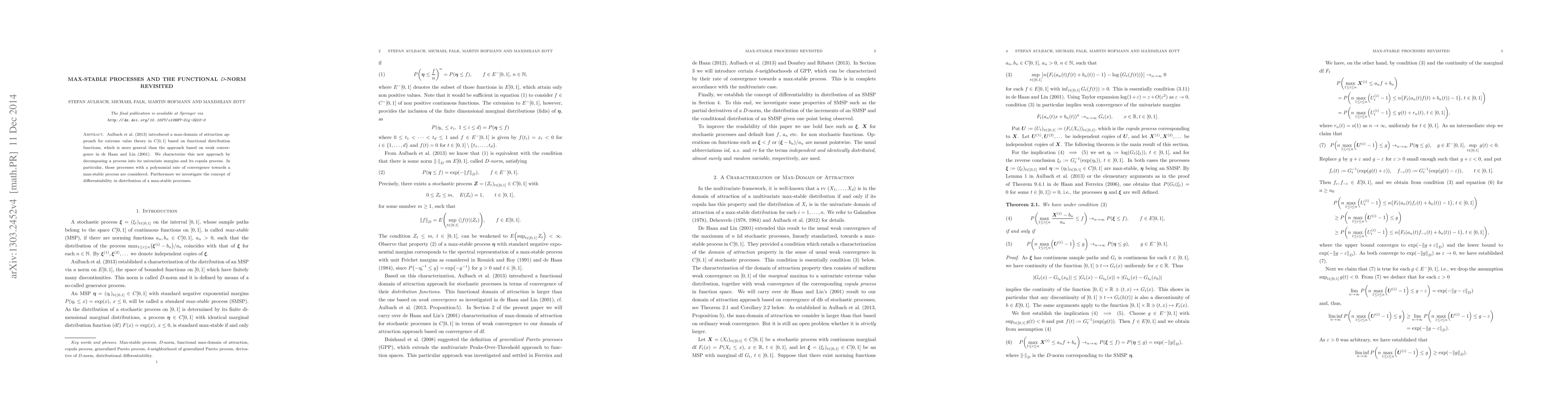 This paper revisits max-stable processes using a functional D-norm approach, which characterizes these processes as decomposed into univariate margins and copula processes. It also investigates the concept of differentiability in distribution for max-stable processes with polynomial rate of convergence.