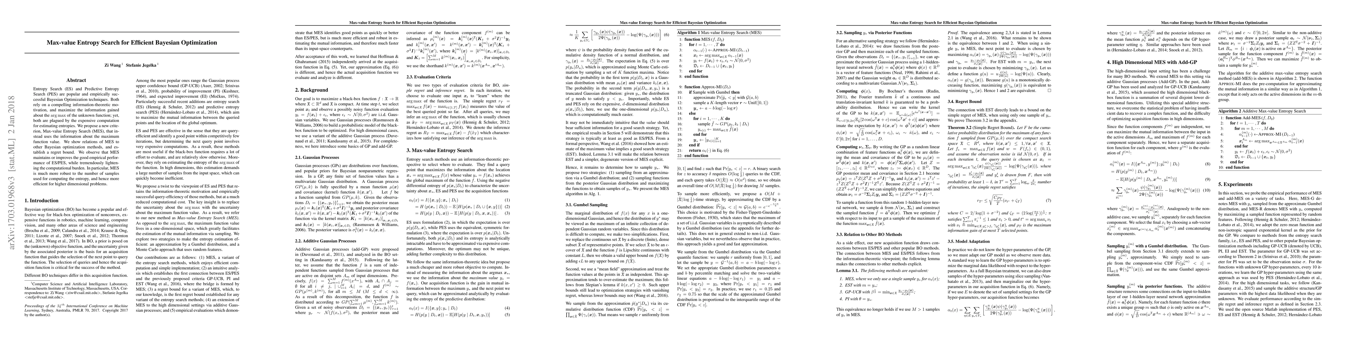 This paper introduces Max-value Entropy Search (MES), a new Bayesian optimization technique that replaces the computationally expensive entropy estimation with information about the maximum function value, significantly reducing computational burden while maintaining or improving performance compared to traditional Entropy Search (ES) and Predictive Entropy Search (PES). MES is shown to be more efficient, especially for high-dimensional problems.