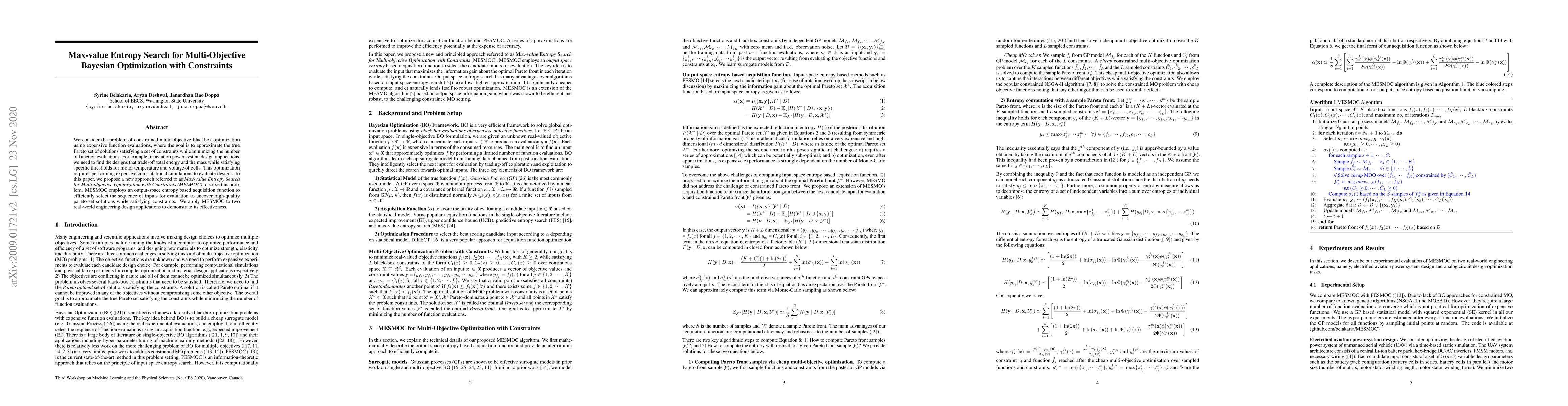 This paper proposes MESMOC, a new method for constrained multi-objective Bayesian optimization that uses an entropy-based acquisition function to efficiently identify high-quality Pareto-set solutions with minimal function evaluations. The effectiveness of MESMOC is demonstrated in two real-world engineering design applications.
