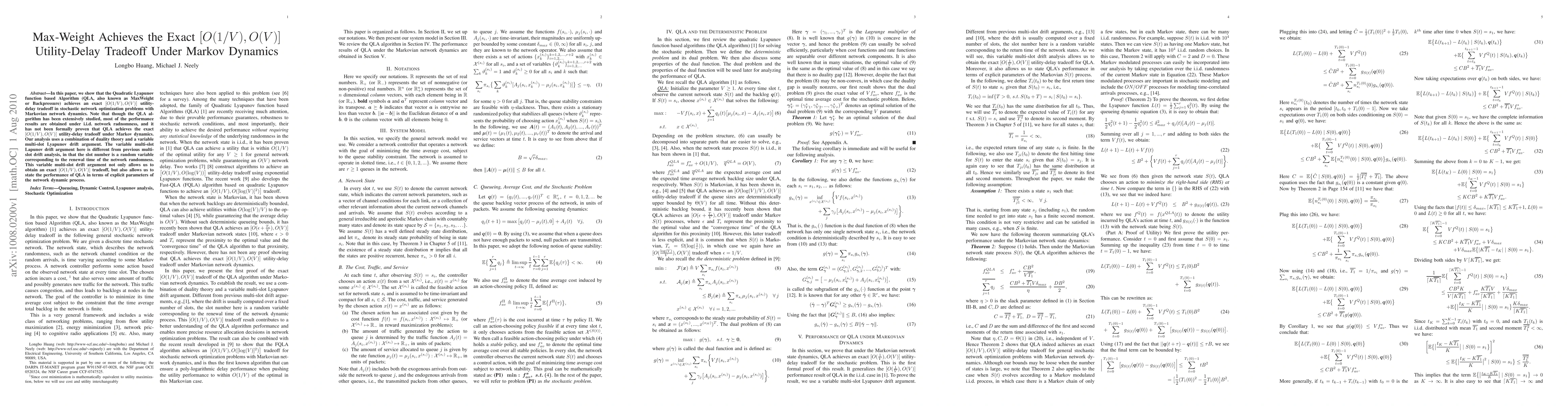 This paper demonstrates that the MaxWeight algorithm achieves an exact $[O(1/V), O(V)]$ utility-delay tradeoff under Markovian network dynamics, a result previously unproven. The analysis leverages a novel variable multi-slot Lyapunov drift argument to account for the stochastic nature of network randomness.