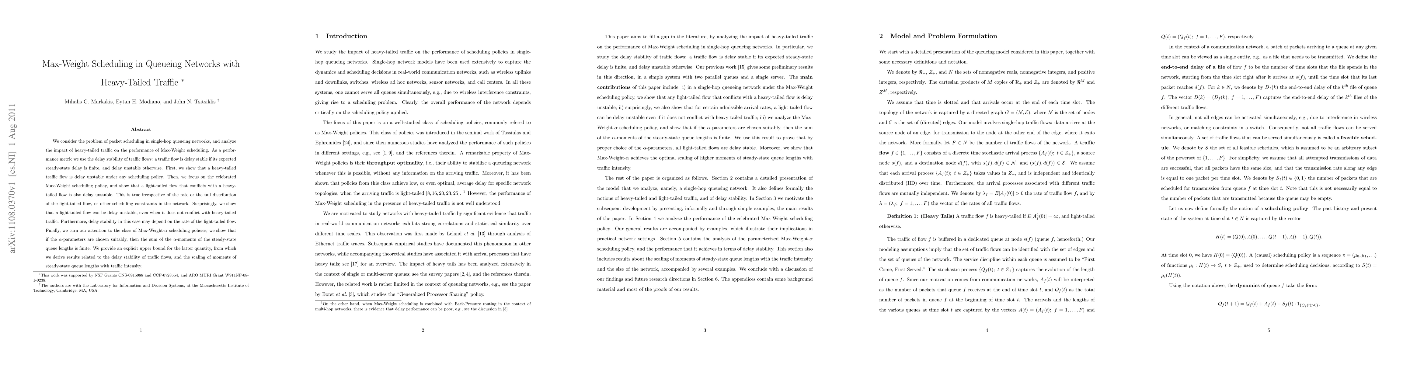We consider the problem of packet scheduling in single-hop queueing networks, and analyze the impact of heavy-tailed traffic on the performance of Max-Weight scheduling. As a performance metric we use the delay stability of traffic flows: a traffic flow is delay stable if its expected steady-state delay is finite, and delay unstable otherwise. First, we show that a heavy-tailed traffic flow is delay unstable under any scheduling policy. Then, we focus on the celebrated Max-Weight scheduling policy, and show that a light-tailed flow that conflicts with a heavy-tailed flow is also delay unstable. This is true irrespective of the rate or the tail distribution of the light-tailed flow, or other scheduling constraints in the network. Surprisingly, we show that a light-tailed flow can be delay unstable, even when it does not conflict with heavy-tailed traffic. Furthermore, delay stability in this case may depend on the rate of the light-tailed flow. Finally, we turn our attention to the class of Max-Weight-a scheduling policies; we show that if the a-parameters are chosen suitably, then the sum of the a-moments of the steady-state queue lengths is finite. We provide an explicit upper bound for the latter quantity, from which we derive results related to the delay stability of traffic flows, and the scaling of moments of steady-state queue lengths with traffic intensity.