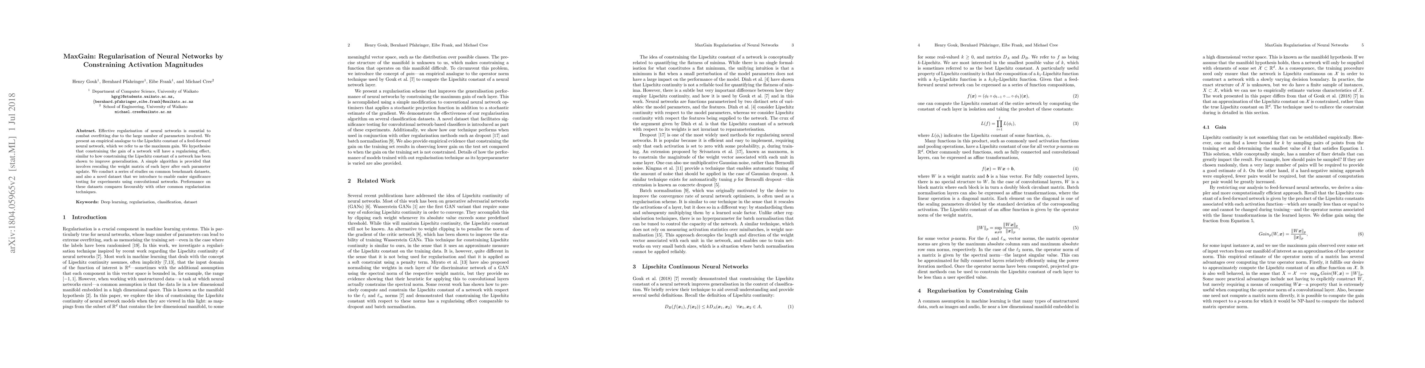 This paper proposes a novel regularisation method called MaxGain, which constrains the activation magnitudes of neural networks to mimic the effect of Lipschitz constant constraints. The method involves rescaling the weight matrix after each update, and empirical studies show it performs competitively against other regularisation techniques on benchmark datasets.