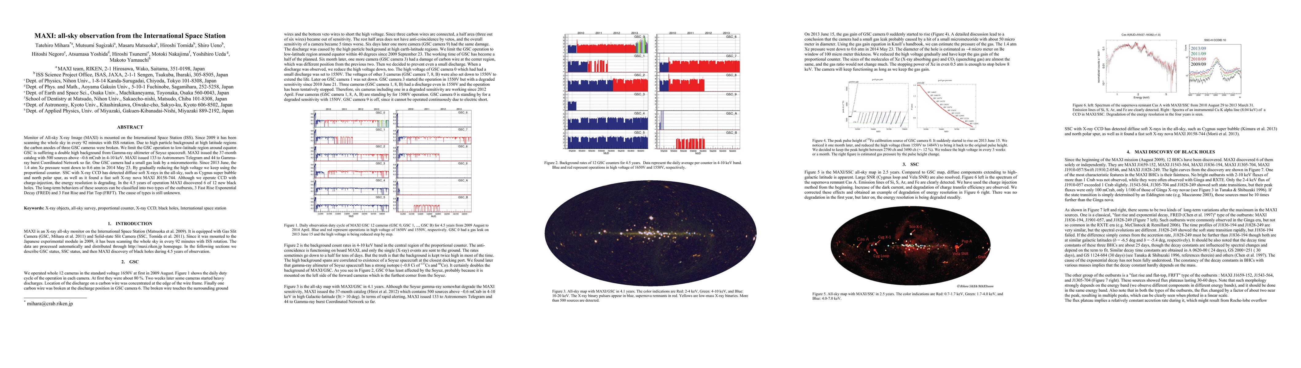 The Monitor of All-sky X-ray Image (MAXI) on the ISS has been observing the entire sky every 92 minutes since 2009, cataloging 500 sources. Despite high-latitude particle background and operational challenges, it continues to detect diffuse X-rays and classify black hole outbursts into two types.