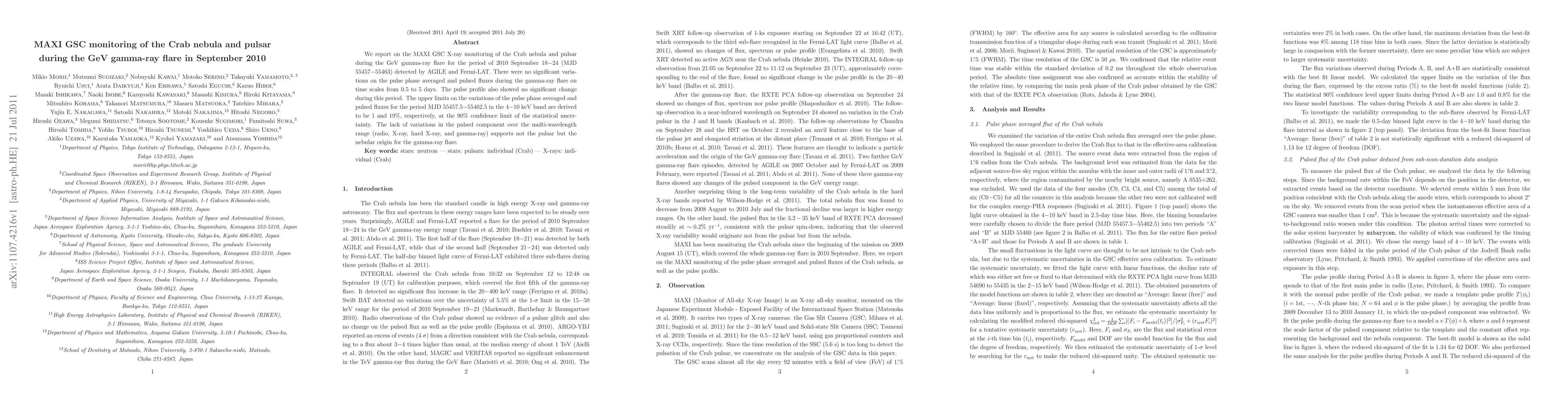We report on the MAXI GSC X-ray monitoring of the Crab nebula and pulsar during the GeV gamma-ray flare for the period of 2010 September 18-24 (MJD 55457-55463) detected by AGILE and Fermi-LAT. There were no significant variations on the pulse phase averaged and pulsed fluxes during the gamma-ray flare on time scales from 0.5 to 5 days. The pulse profile also showed no significant change during this period. The upper limits on the variations of the pulse phase averaged and pulsed fluxes for the period MJD 55457.5-55462.5 in the 4-10 keV band are derived to be 1 and 19%, respectively, at the 90% confidence limit of the statistical uncertainty. The lack of variations in the pulsed component over the multi-wavelength range (radio, X-ray, hard X-ray, and gamma-ray) supports not the pulsar but the nebular origin for the gamma-ray flare.