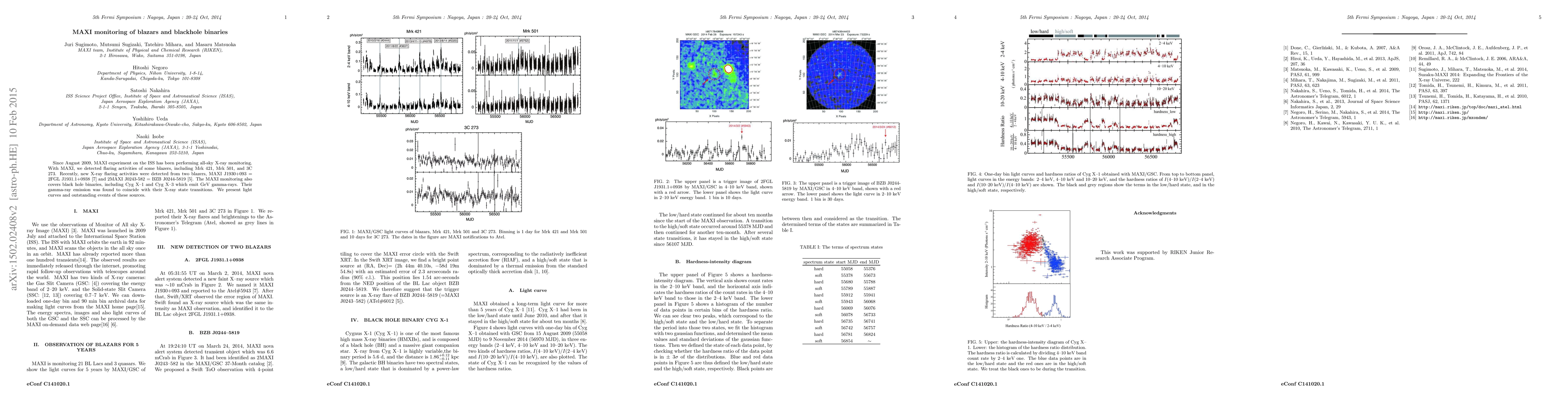 The MAXI experiment on the ISS has detected flaring activities in several blazars since 2009, including notable events in Mrk 421, Mrk 501, and 3C 273. Recent observations have also captured new X-ray flares from MAXI J1930+093 and MAXI J0243-582. Additionally, MAXI monitoring of black hole binaries like Cyg X-1 and Cyg X-3 revealed gamma-ray emissions coinciding with their X-ray state transitions.
