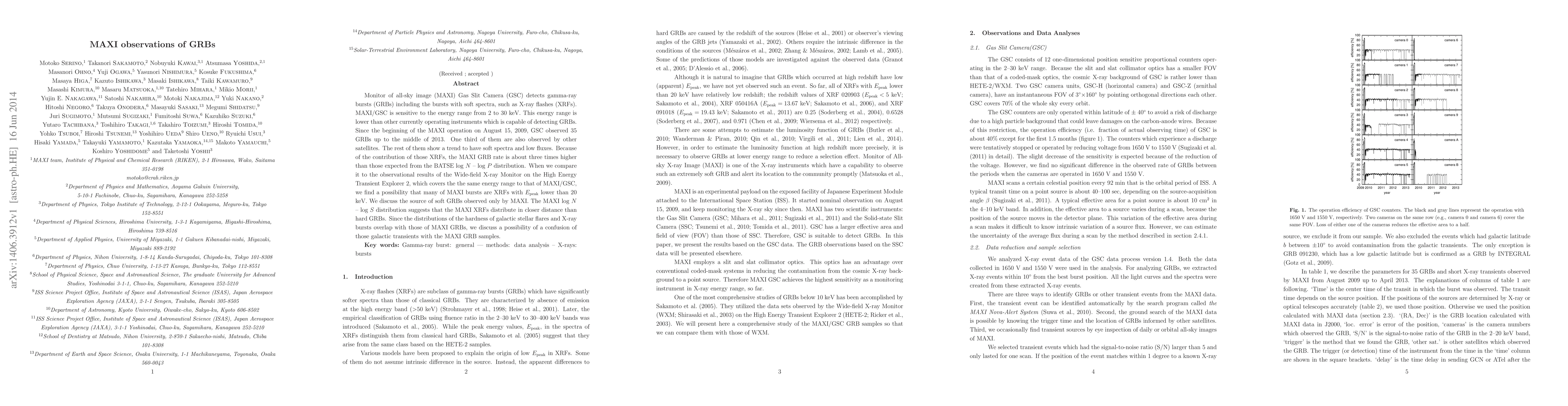Monitor of all-sky image (MAXI) Gas Slit Camera (GSC) detects gamma-ray bursts (GRBs) including the bursts with soft spectra, such as X-ray flashes (XRFs). MAXI/GSC is sensitive to the energy range from 2 to 30 keV. This energy range is lower than other currently operating instruments which is capable of detecting GRBs. Since the beginning of the MAXI operation on August 15, 2009, GSC observed 35 GRBs up to the middle of 2013. One third of them are also observed by other satellites. The rest of them show a trend to have soft spectra and low fluxes. Because of the contribution of those XRFs, the MAXI GRB rate is about three times higher than those expected from the BATSE log N - log P distribution. When we compare it to the observational results of the Wide-field X-ray Monitor on the High Energy Transient Explorer 2, which covers the the same energy range to that of MAXI/GSC, we find a possibility that many of MAXI bursts are XRFs with Epeak lower than 20 keV. We discuss the source of soft GRBs observed only by MAXI. The MAXI log N - log S distribution suggests that the MAXI XRFs distribute in closer distance than hard GRBs. Since the distributions of the hardness of galactic stellar flares and X-ray bursts overlap with those of MAXI GRBs, we discuss a possibility of a confusion of those galactic transients with the MAXI GRB samples.