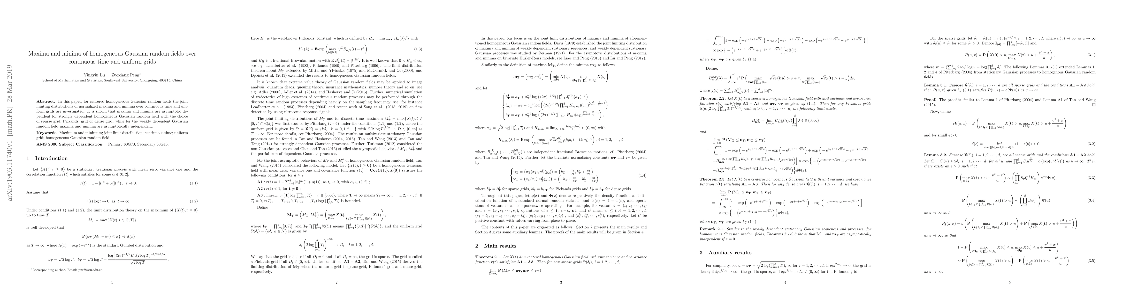 In this paper, for centered homogeneous Gaussian random fields the joint limiting distributions of normalized maxima and minima over continuous time and uniform grids are investigated. It is shown that maxima and minima are asymptotic dependent for strongly dependent homogeneous Gaussian random field with the choice of sparse grid, Pickands' grid or dense grid, while for the weakly dependent Gaussian random field maxima and minima are asymptotically independent.