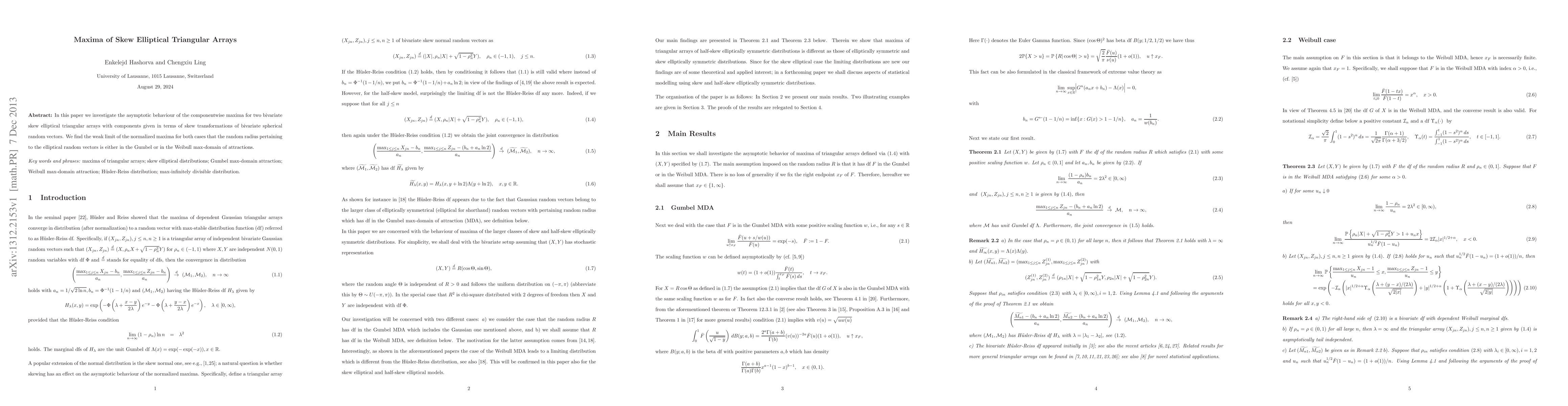 This paper examines the asymptotic behavior of the maxima in two bivariate skew elliptical triangular arrays, revealing the weak limit of normalized maxima when the random radius falls within the Gumbel or Weibull max-domain of attractions. The findings provide insights into the limiting distributions of these maxima.