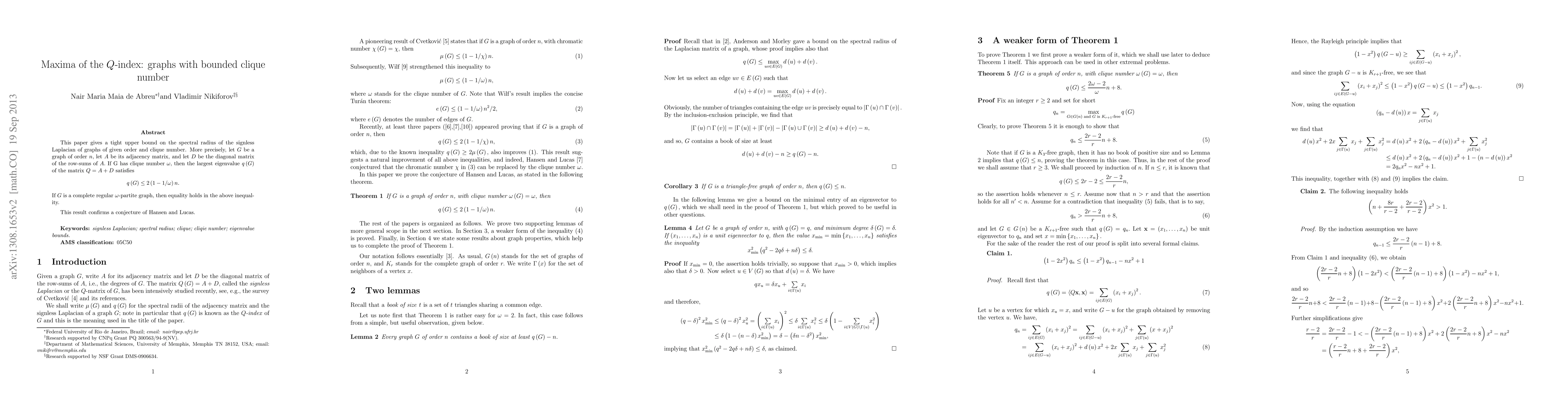 Researchers found a tight upper bound on the largest eigenvalue of the signless Laplacian matrix for graphs with a given clique number, confirming a conjecture about complete regular r-partite graphs.
