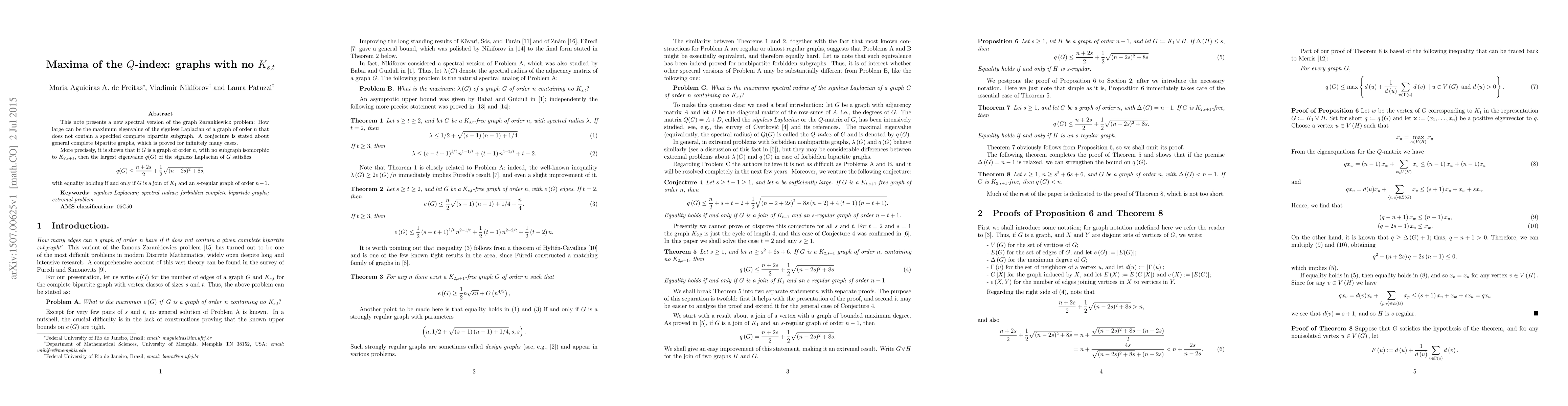 The paper proves a spectral version of the Zarankiewicz problem for graphs without specified complete bipartite subgraphs, showing a bound on the maximum eigenvalue of their signless Laplacian.