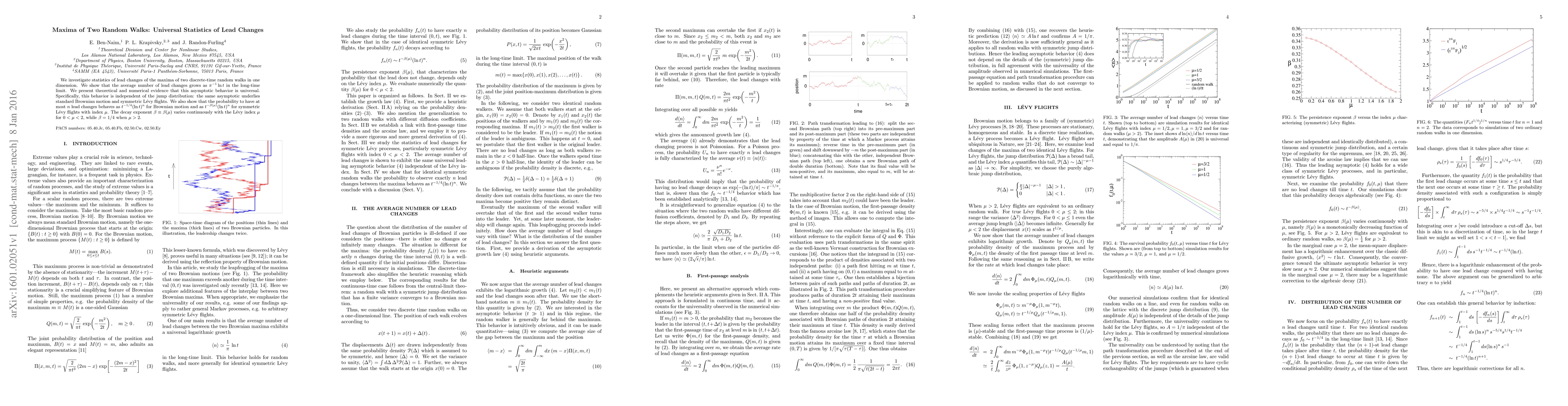 We investigate statistics of lead changes of the maxima of two discrete-time random walks in one dimension. We show that the average number of lead changes grows as $\pi^{-1}\ln(t)$ in the long-time limit. We present theoretical and numerical evidence that this asymptotic behavior is universal. Specifically, this behavior is independent of the jump distribution: the same asymptotic underlies standard Brownian motion and symmetric Levy flights. We also show that the probability to have at most n lead changes behaves as $t^{-1/4}[\ln t]^n$ for Brownian motion and as $t^{-\beta(\mu)}[\ln t]^n$ for symmetric Levy flights with index $\mu$. The decay exponent $\beta(\mu)$ varies continuously with the Levy index when $0<\mu<2$, while $\beta=1/4$ for $\mu>2$.