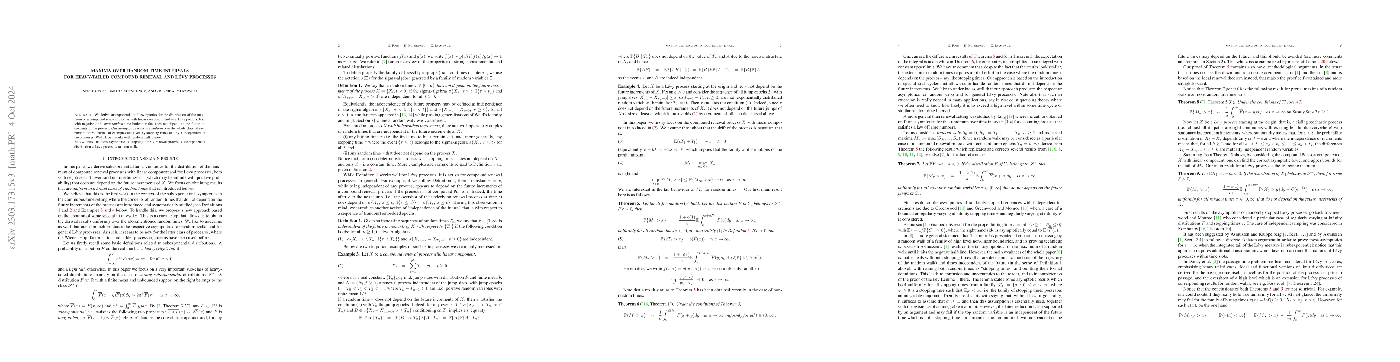 This paper derives subexponential tail asymptotics for the maximum of a compound renewal process and a Lévy process over random time intervals, showing uniform results across the class of such intervals. The findings connect with random walk theory.