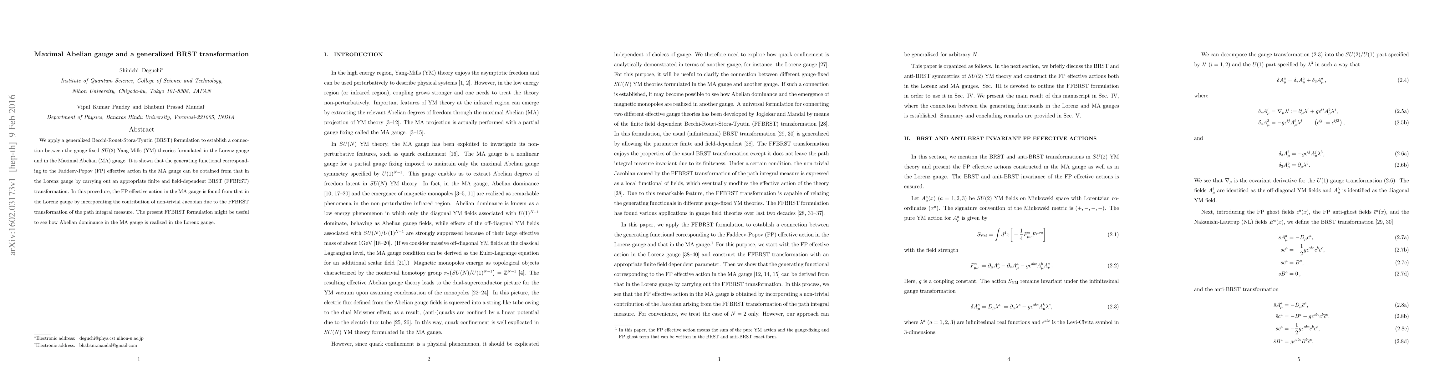 We apply a generalized Becchi-Rouet-Stora-Tyutin (BRST) formulation to establish a connection between the gauge-fixed $SU(2)$ Yang-Mills (YM) theories formulated in the Lorenz gauge and in the Maximal Abelian (MA) gauge. It is shown that the generating functional corresponding to the Faddeev-Popov (FP) effective action in the MA gauge can be obtained from that in the Lorenz gauge by carrying out an appropriate finite and field-dependent BRST (FFBRST) transformation. In this procedure, the FP effective action in the MA gauge is found from that in the Lorenz gauge by incorporating the contribution of non-trivial Jacobian due to the FFBRST transformation of the path integral measure. The present FFBRST formulation might be useful to see how Abelian dominance in the MA gauge is realized in the Lorenz gauge.