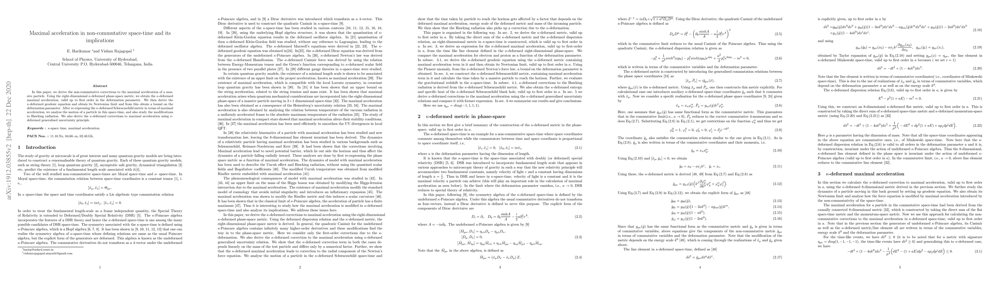 This paper derives the non-commutative corrections to the maximal acceleration of a particle in an eight-dimensional kappa-deformed phase-space, obtaining a kappa-deformed maximal acceleration and exploring its implications on geodesics, Schwarzschild metric, and Hawking radiation.