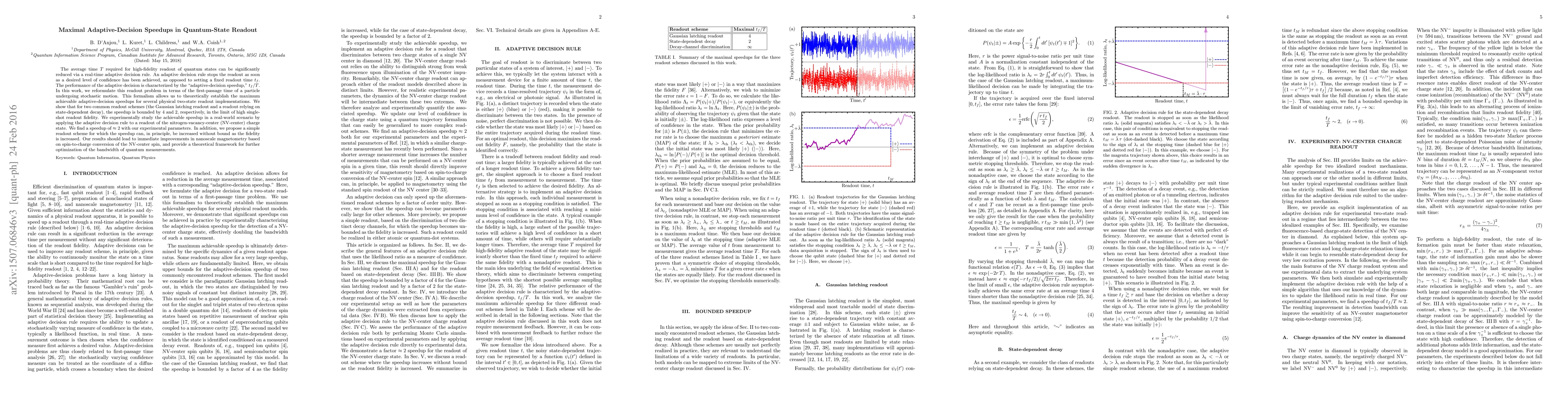 This research paper presents a method to significantly reduce the time required for high-fidelity quantum state readout using an adaptive decision rule. Theoretical analysis shows maximum speedup bounds of 4 and 2 for Gaussian latching readout and state-dependent decay schemes, respectively. Experimental implementation on NV-center charge state readout achieves a speedup of approximately 2. The paper also proposes a new readout scheme with potentially unbounded speedup as fidelity increases, promising enhancements in nanoscale magnetometry and quantum measurement bandwidth optimization.