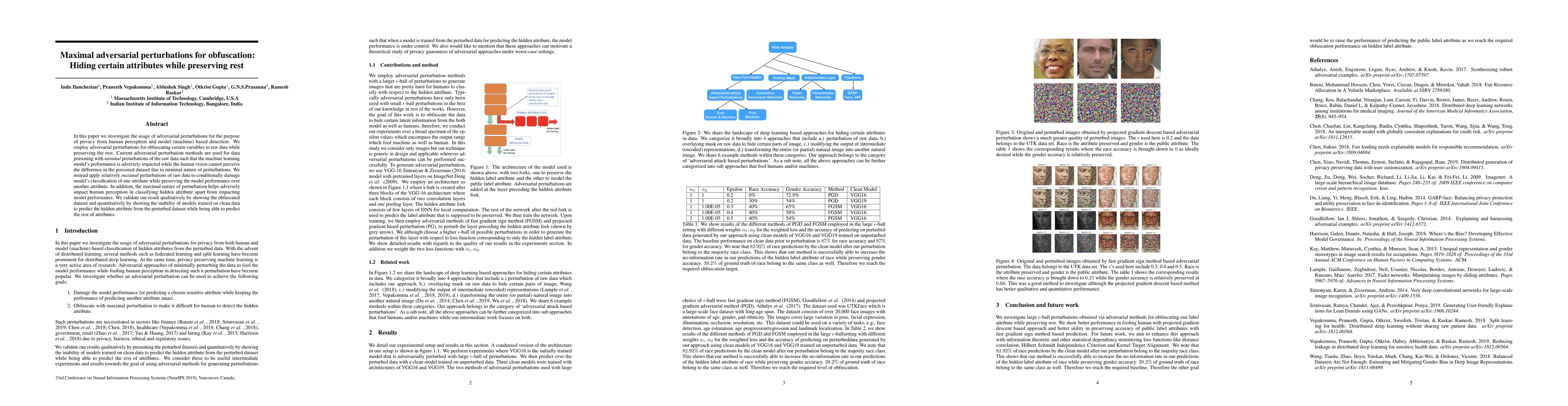 This paper explores the use of maximal adversarial perturbations to obfuscate specific data attributes while preserving others, both for human perception and machine detection. The study demonstrates that these perturbations can impair model classification of hidden attributes while maintaining performance on others, validated through qualitative and quantitative assessments.
