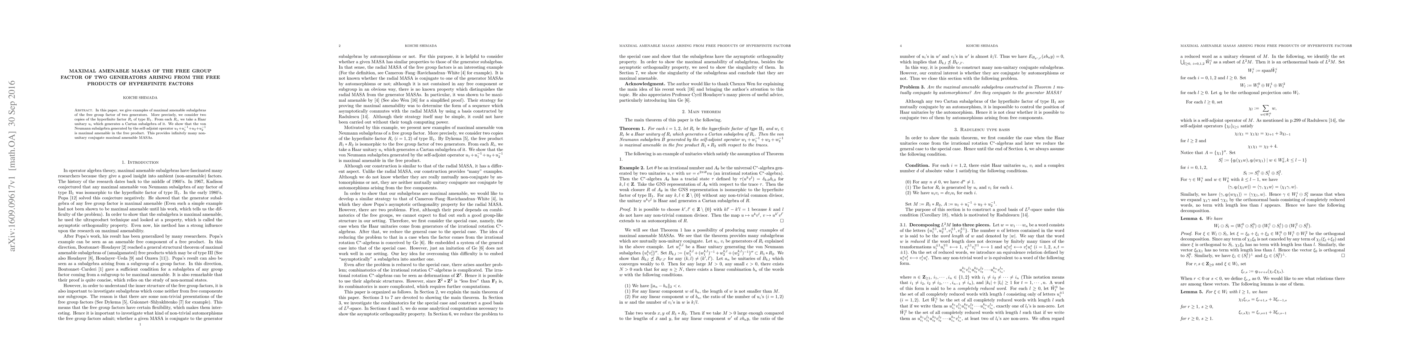 This paper demonstrates examples of maximal amenable subalgebras (MASAs) in the free group factor of two generators, arising from free products of hyperfinite factors. Specifically, it shows that the von Neumann subalgebra generated by the self-adjoint operator $u_1+u_1^{-1}+u_2+u_2^{-1}$ is maximal amenable, providing infinitely many non-unitary conjugate MASAs.