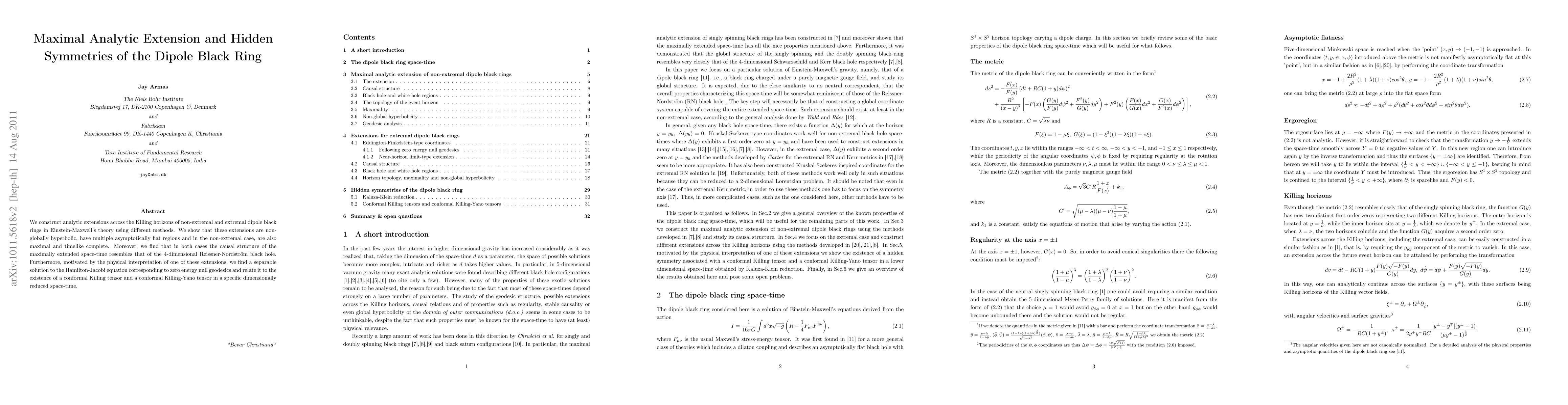 We construct analytic extensions across the Killing horizons of non-extremal and extremal dipole black rings in Einstein-Maxwell's theory using different methods. We show that these extensions are non-globally hyperbolic, have multiple asymptotically flat regions and in the non-extremal case, are also maximal and timelike complete. Moreover, we find that in both cases the causal structure of the maximally extended space-time resembles that of the 4-dimensional Reissner-Nordstr\"om black hole. Furthermore, motivated by the physical interpretation of one of these extensions, we find a separable solution to the Hamilton-Jacobi equation corresponding to zero energy null geodesics and relate it to the existence of a conformal Killing tensor and a conformal Killing-Yano tensor in a specific dimensionally reduced space-time.