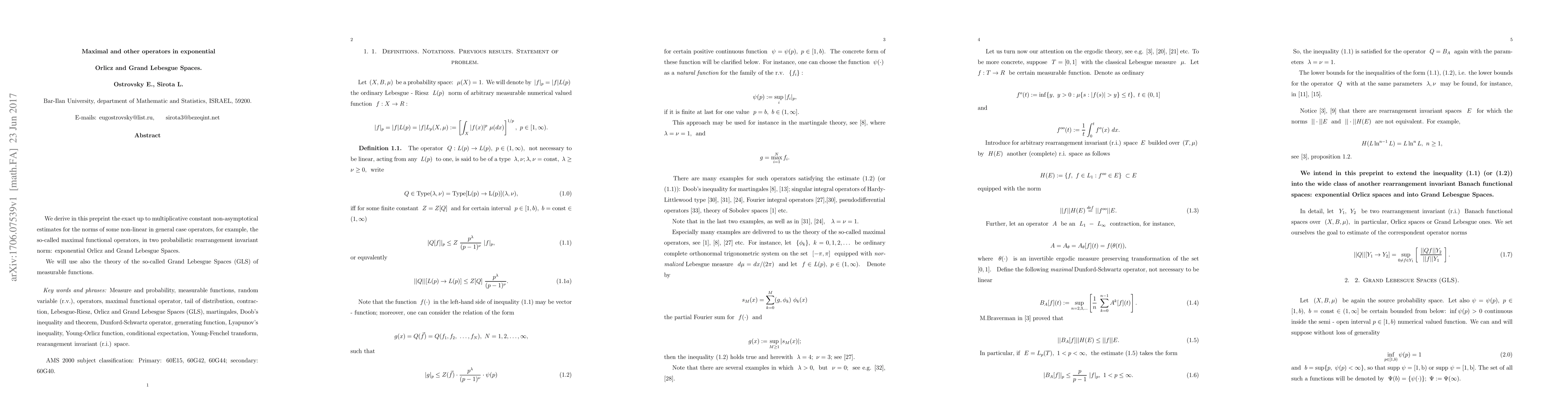 We derive in this preprint the exact up to multiplicative constant non-asymptotical estimates for the norms of some non-linear in general case operators, for example, the so-called maximal functional operators, in two probabilistic rearrangement invariant norm: exponential Orlicz and Grand Lebesgue Spaces. We will use also the theory of the so-called Grand Lebesgue Spaces (GLS) of measurable functions.