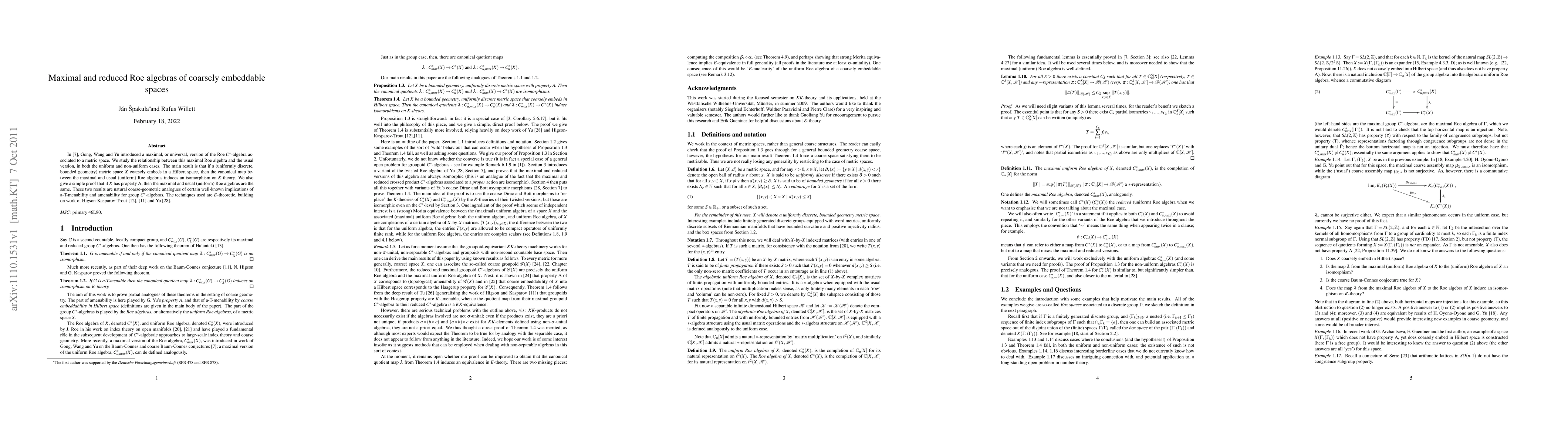 Gong, Wang and Yu introduced a maximal, or universal, version of the Roe C*-algebra associated to a metric space. We study the relationship between this maximal Roe algebra and the usual version, in both the uniform and non-uniform cases. The main result is that if a (uniformly discrete, bounded geometry) metric space X coarsely embeds in a Hilbert space, then the canonical map between the maximal and usual (uniform) Roe algebras induces an isomorphism on K-theory. We also give a simple proof that if X has property A, then the maximal and usual (uniform) Roe algebras are the same. These two results are natural coarse-geometric analogues of certain well-known implications of a-T-menability and amenability for group C*-algebras. The techniques used are E-theoretic, building on work of Higson-Kasparov-Trout and Yu.
