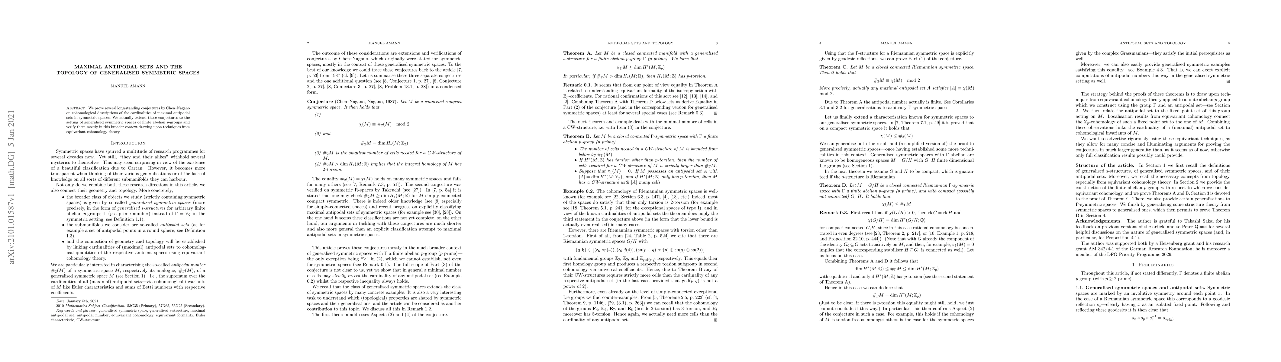 This paper proves long-standing conjectures by Chen--Nagano on maximal antipodal sets in symmetric spaces, extending them to generalised symmetric spaces of finite abelian $p$-groups, and verifies them using equivariant cohomology techniques.