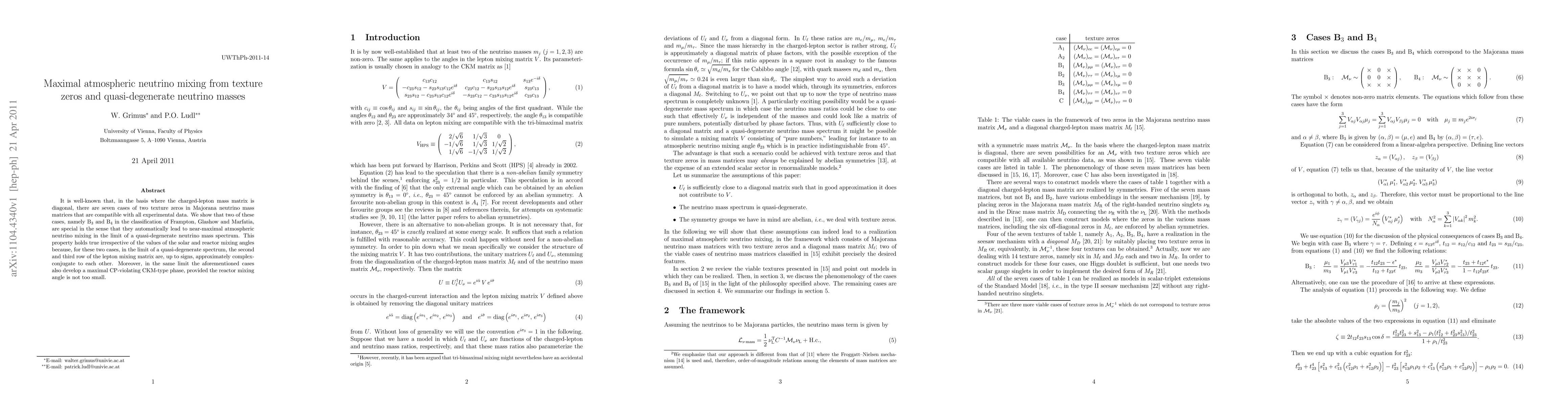 This paper explores two specific texture zero cases (B3 and B4) in the Majorana neutrino mass matrix that lead to near-maximal atmospheric neutrino mixing when neutrino masses are quasi-degenerate. These cases also exhibit a maximal CP-violating phase in the limit, regardless of the solar and reactor mixing angles.