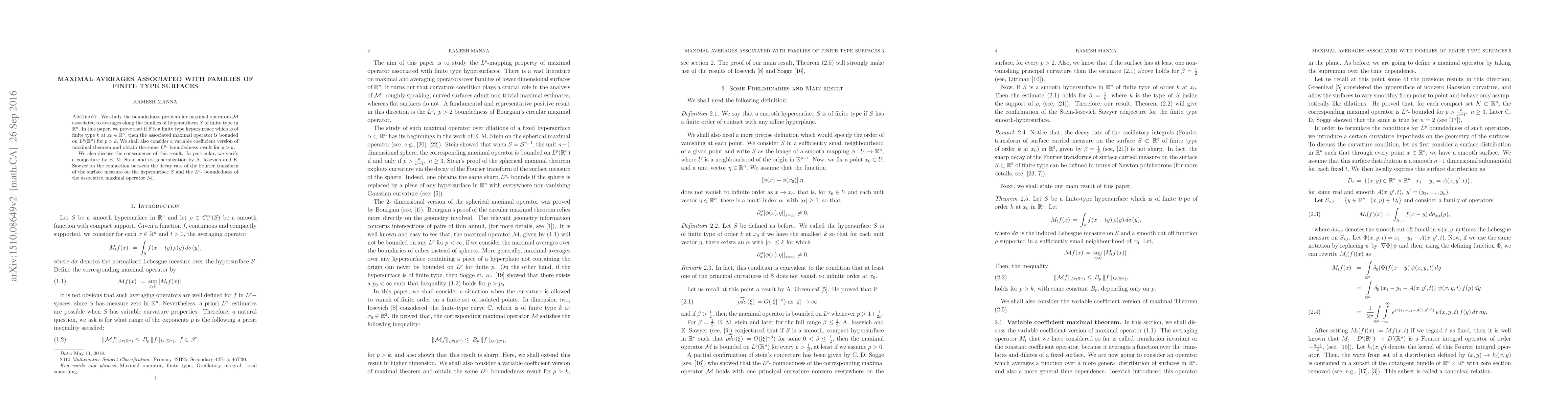 We study the boundedness problem for maximal operators $\mathcal{M}$ associated to averages along families of hypersurfaces $S$ of finite type in $\mathbb{R}^n.$ In this paper, we prove that if $S$ is a finite type hypersurface which is of finite type $k$ at $x_0 \in \mathbb{R}^n$, then the associated maximal operator is bounded on $L^p(\mathbb{R}^n)$ for $p>k.$ We shall also consider a variable coefficient version of maximal theorem and we obtain the same $L^p-$ boundedness result for $p>k.$ We also discuss the consequence of this result. In particular, we verify a conjecture by E. M. Stein and its generalization by A. Iosevich and E. Sawyer on the connection between the decay rate of the Fourier transform of the surface measure on $S$ and the $L^p-$ boundedness of the associated maximal operator $\mathcal{M}.$