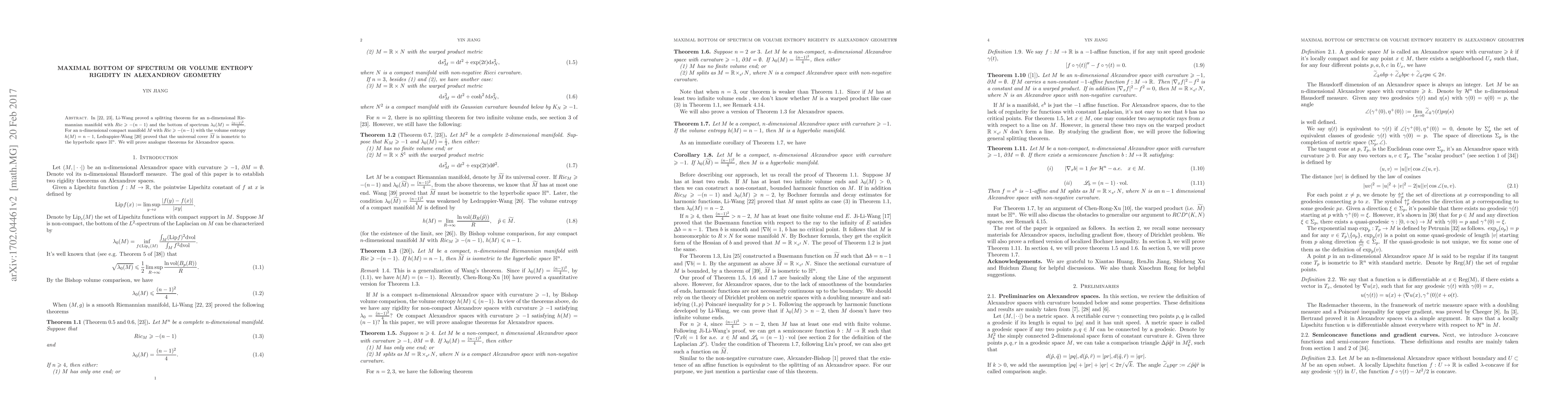 In \cite{LiWang2001complete1,LiWang2001complete2}, Li-Wang proved a splitting theorem for an n-dimensional Riemannian manifold with $Ric\geqslant -(n-1)$ and the bottom of spectrum $\lambda_0(M)=\frac{(n-1)^2}{4}$. For an n-dimensional compact manifold $M$ with $Ric\geqslant-(n-1)$ with the volume entropy $h(M)=n-1$, Ledrappier-Wang \cite{LeW2010volent} proved that the universal cover $\tilde{M}$ is isometric to the hyperbolic space $\mathbb{H}^n$. We will prove analogue theorems for Alexandrov spaces.