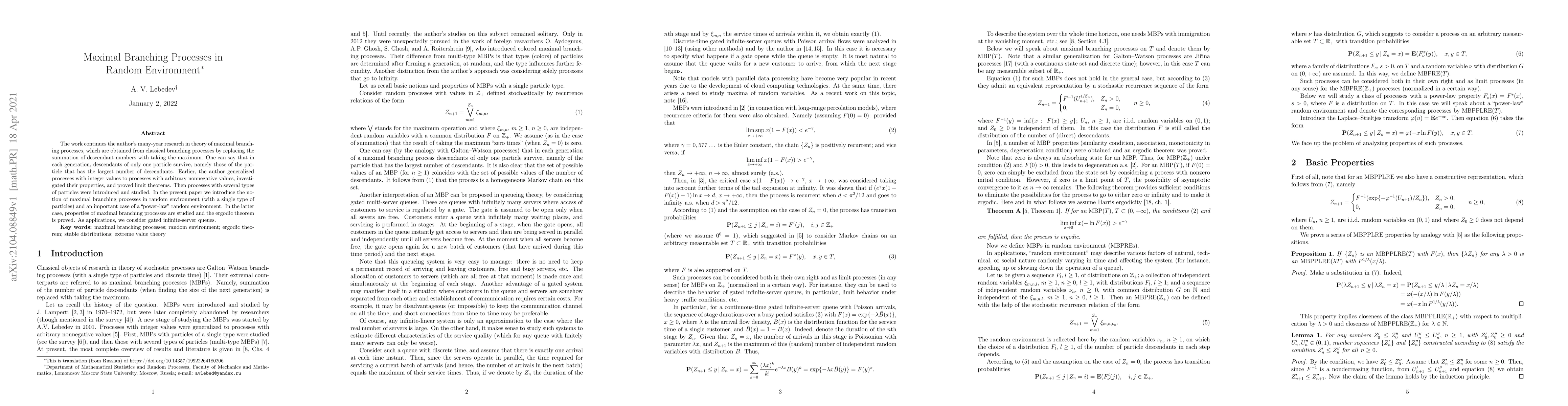 This paper extends the study of maximal branching processes, focusing on those in random environments, particularly with "power-law" distributions. The authors prove the ergodic theorem for these processes and apply the findings to gated infinite-server queues.