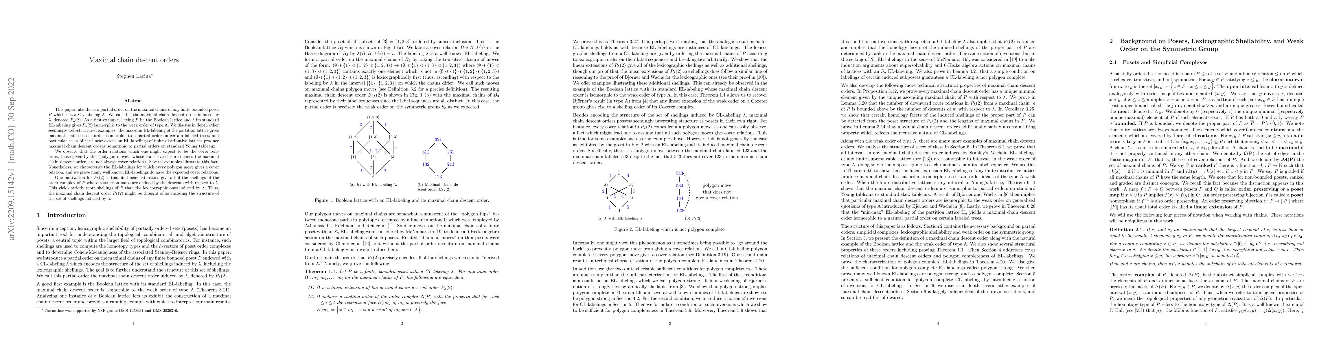 This paper introduces a maximal chain descent order $P_{\lambda}(2)$ on the maximal chains of finite bounded posets $P$ with a CL-labeling $\lambda$, showing its isomorphism to various well-known structures like the weak order of type A and partial orders on labeled trees. It also characterizes EL-labelings where polygon moves are cover relations.