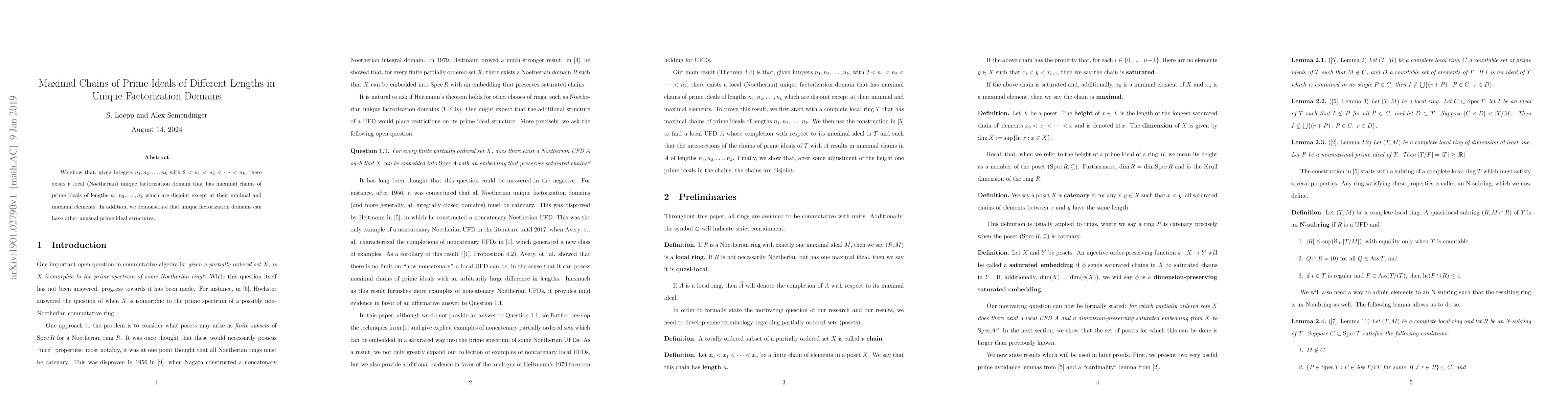 This paper constructs a local Noetherian unique factorization domain with maximal chains of prime ideals of specified lengths, demonstrating the existence of diverse prime ideal structures beyond typical expectations.
