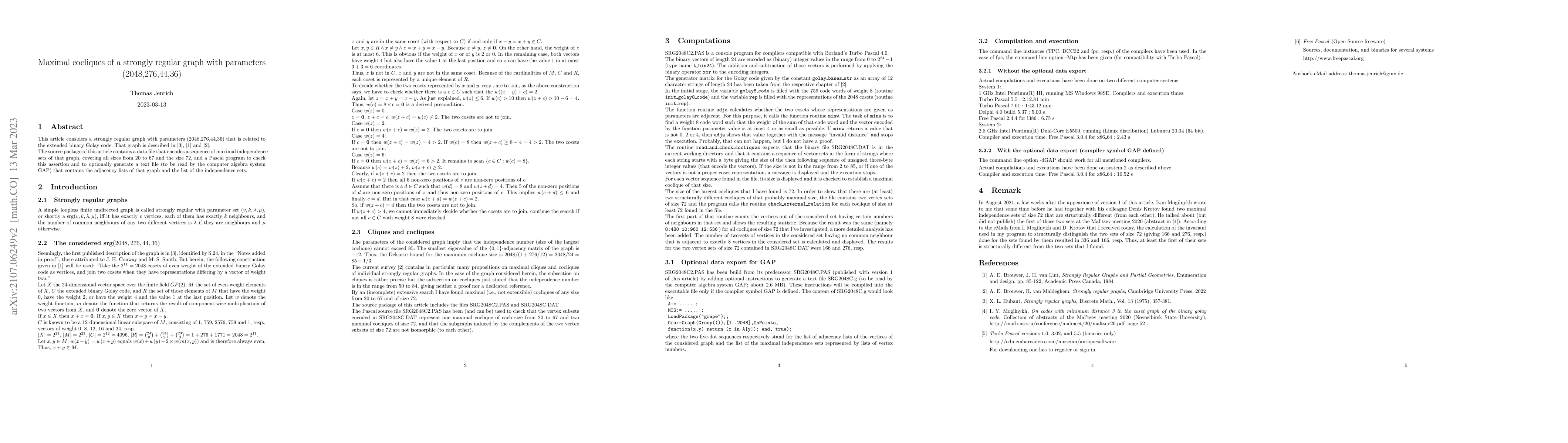 This article considers a strongly regular graph with parameters (2048,276,44,36) that is related to the extended binary Golay code. That graph is known since about 1975 but there seems to be not much information on the contained maximal cocliques. The source package of this article contains a data file that encodes a sequence of maximal independence sets of that graph, covering all sizes from 20 to 67 and the size 72, and a Pascal program to check this assertion and to optionally generate a text file (to be read by the computer algebra system GAP) that contains the adjacency lists of that graph and the list of the independence sets.