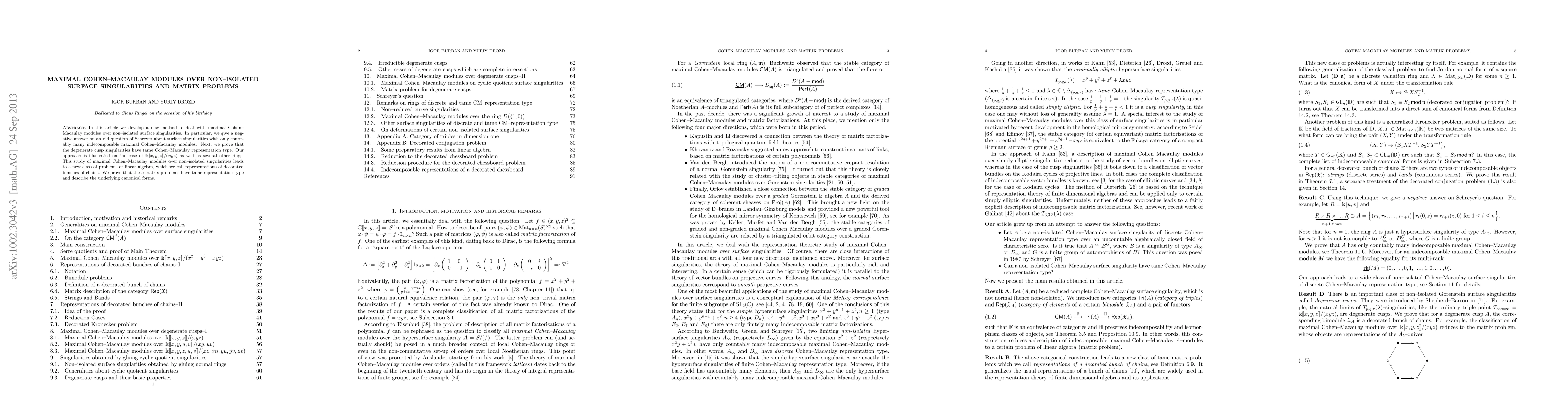 In this article we develop a new method to deal with maximal Cohen-Macaulay modules over non-isolated surface singularities. In particular, we give a negative answer on an old question of Schreyer about surface singularities with only countably many indecomposable maximal Cohen-Macaulay modules. Next, we prove that the degenerate cusp singularities have tame Cohen-Macaulay representation type. Our approach is illustrated on the case of $k\llbracket x,y,z\rrbracket/(xyz)$ as well as several other rings. This study of maximal Cohen-Macaulay modules over non-isolated singularities leads to a new class of problems of linear algebra, which we call representations of decorated bunches of chains. We prove that these matrix problems have tame representation type and describe the underlying canonical forms.