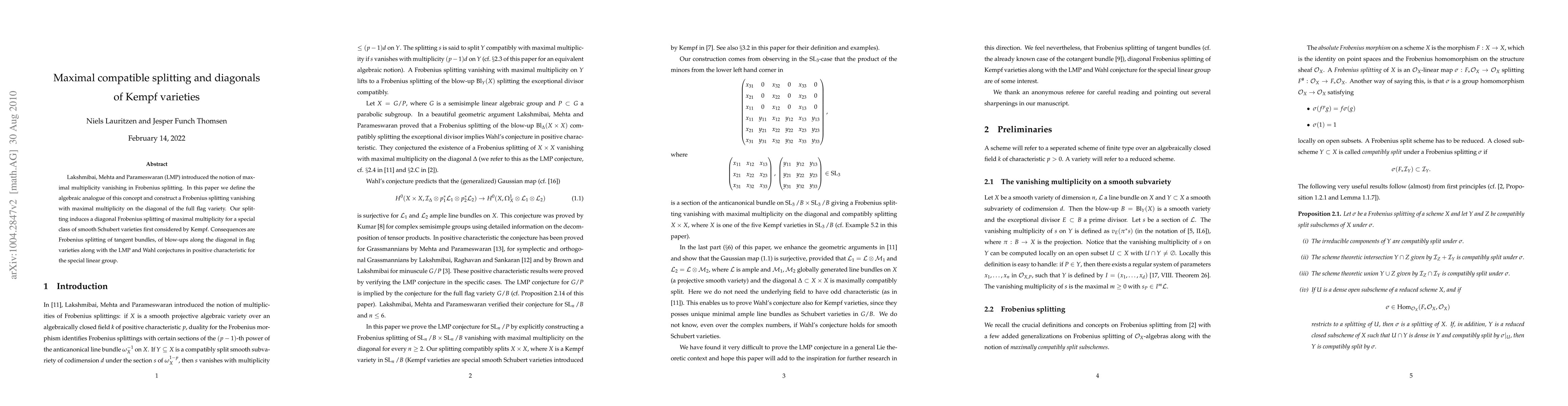 Lakshmibai, Mehta and Parameswaran (LMP) introduced the notion of maximal multiplicity vanishing in Frobenius splitting. In this paper we define the algebraic analogue of this concept and construct a Frobenius splitting vanishing with maximal multiplicity on the diagonal of the full flag variety. Our splitting induces a diagonal Frobenius splitting of maximal multiplicity for a special class of smooth Schubert varieties first considered by Kempf. Consequences are Frobenius splitting of tangent bundles, of blow-ups along the diagonal in flag varieties along with the LMP and Wahl conjectures in positive characteristic for the special linear group.