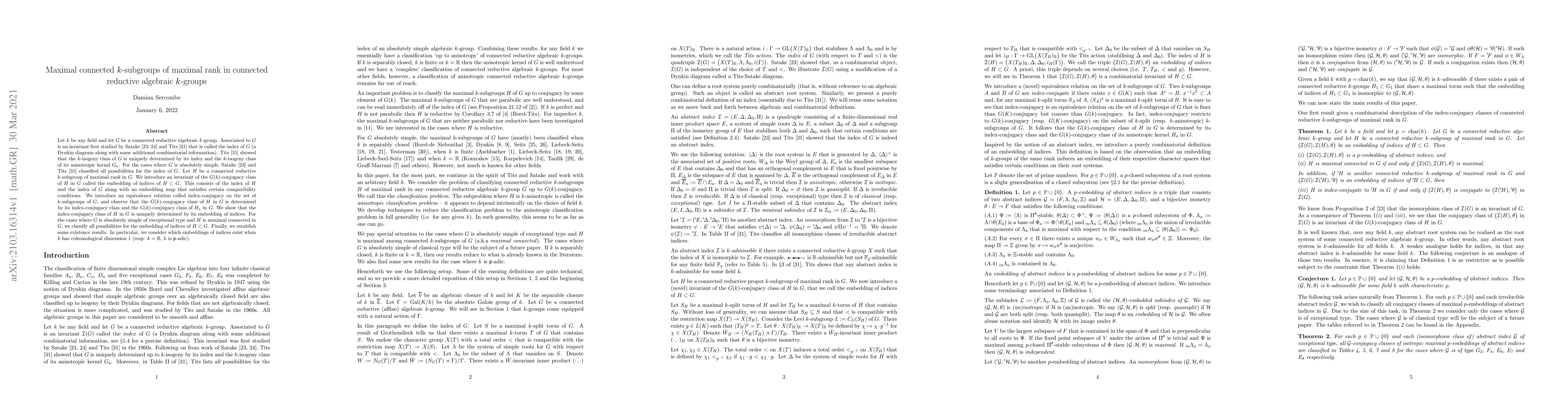 This paper studies connected reductive algebraic k-groups and their maximal connected subgroups of maximal rank, introducing an invariant called the embedding of indices that determines their G(k)-conjugacy class uniquely in certain cases.