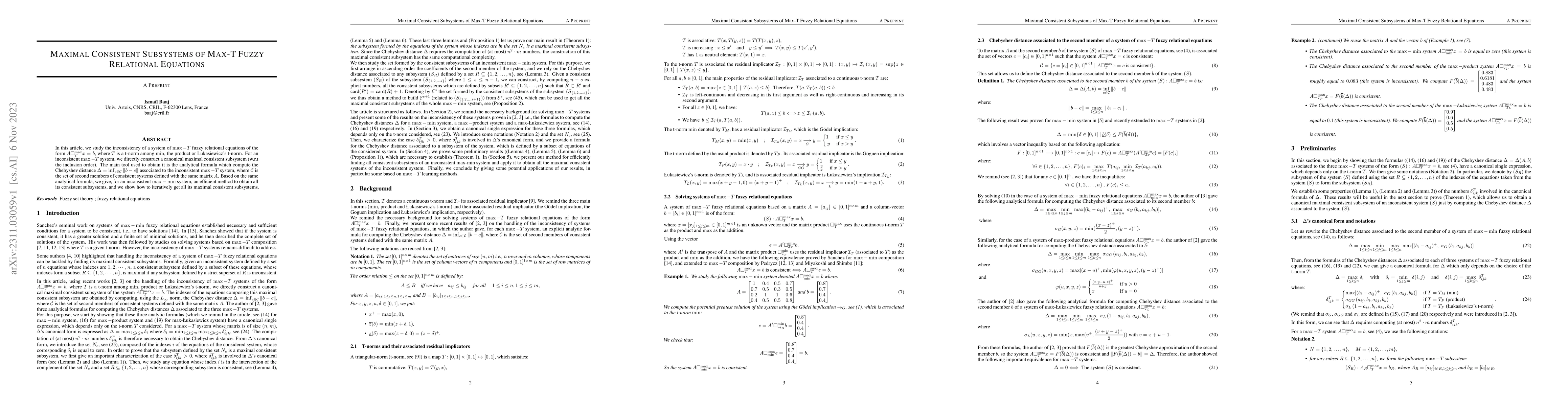 In this article, we study the inconsistency of a system of $\max-T$ fuzzy relational equations of the form $A \Box_{T}^{\max} x = b$, where $T$ is a t-norm among $\min$, the product or Lukasiewicz's t-norm. For an inconsistent $\max-T$ system, we directly construct a canonical maximal consistent subsystem (w.r.t the inclusion order). The main tool used to obtain it is the analytical formula which compute the Chebyshev distance $\Delta = \inf_{c \in \mathcal{C}} \Vert b - c \Vert$ associated to the inconsistent $\max-T$ system, where $\mathcal{C}$ is the set of second members of consistent systems defined with the same matrix $A$. Based on the same analytical formula, we give, for an inconsistent $\max-\min$ system, an efficient method to obtain all its consistent subsystems, and we show how to iteratively get all its maximal consistent subsystems.