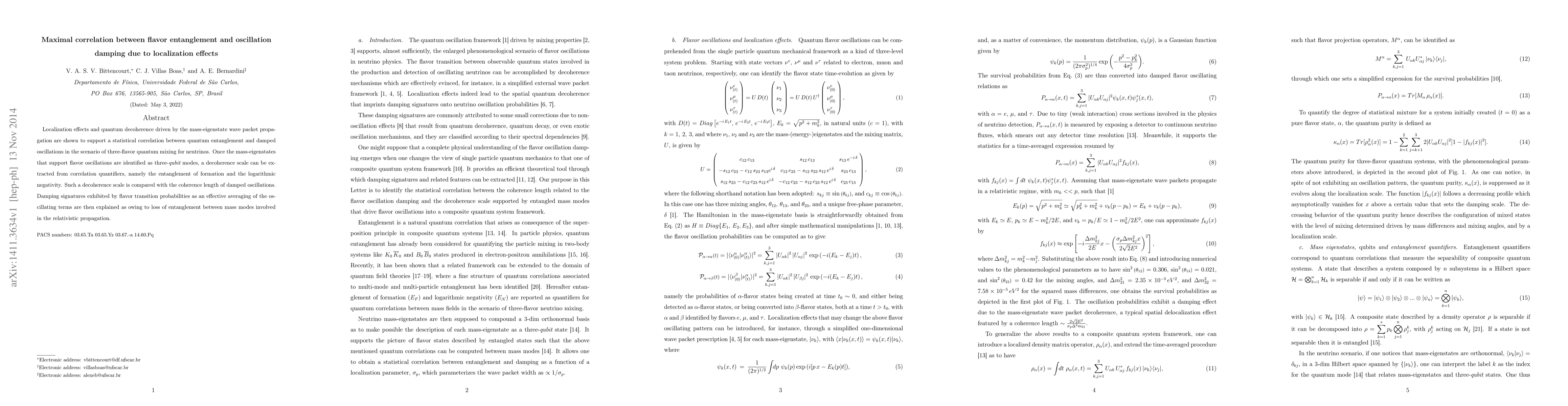 This paper explores the statistical correlation between flavor entanglement and oscillation damping in three-flavor neutrino mixing, attributing damping effects to localization and decoherence. The study identifies a decoherence scale from entanglement quantifiers and links it to the coherence length of damped oscillations, explaining damping as a result of lost entanglement during relativistic propagation.