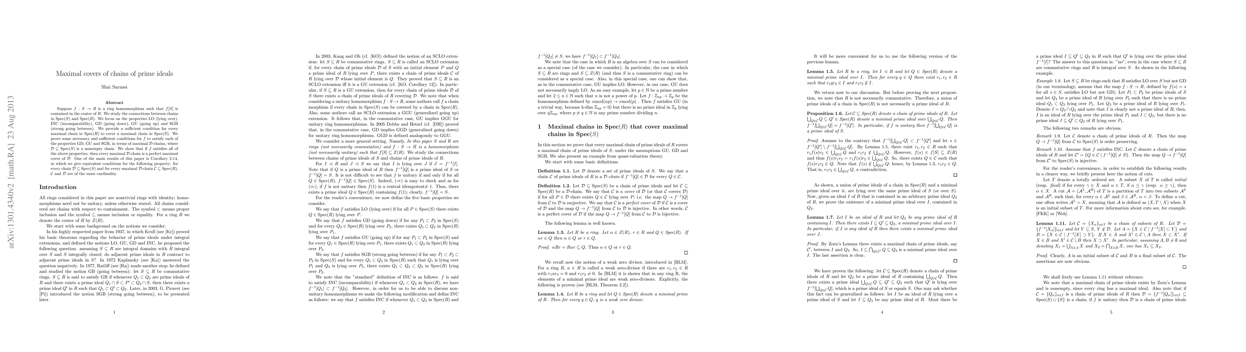 Suppose $f:S \rightarrow R$ is a ring homomorphism such that $f[S] $ is contained in the center of $R$. We study the connections between chains in $\text{Spec} (S)$ and chains in $\text{Spec} (R)$. We focus on the properties LO (lying over), INC (incomparability), GD (going down), GU (going up) and SGB (strong going between). %we define the notion $\mathcal D$-chain which is a chain $\mathcal C \subseteq \text{Spec} (S)$ such that for all $Q \in \mathcal C$, $f^{-1}[Q] \in \mathcal D$. We provide a sufficient condition for every maximal chain in $\text{Spec} (R)$ to cover a maximal chain in $\text{Spec} (S)$. We prove some necessary and sufficient conditions for $f$ to satisfy each of the properties GD, GU and SGB, in terms of maximal $\mathcal D$-chains, where $\mathcal D \subseteq \text{Spec} (S)$ is a nonempty chain. We show that if $f$ satisfies all of the properties above, then every maximal $\mathcal D$-chain is a perfect maximal cover of $\mathcal D$. Our main result is Corollary \ref{equivalent conditions}, in which we give equivalent conditions for the following property: for every chain $\mathcal D \subseteq {\text Spec} (S)$ and for every maximal $\mathcal D$-chain $\mathcal C \subseteq {\text Spec} (R)$, $\mathcal C$ and $\mathcal D$ are of the same cardinality.